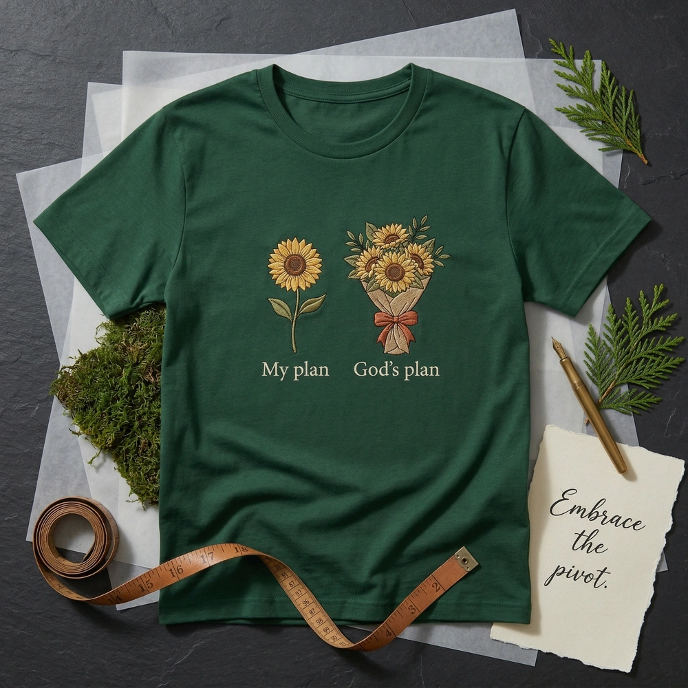 The design illustrates the concept of divine providence. The left side (“Your plan”) shows a single sunflower, representing our limited human perspective. The right side (“God’s plan”) shows a massive bouquet, representing the abundance and greater purpose that is often hidden from our immediate view.