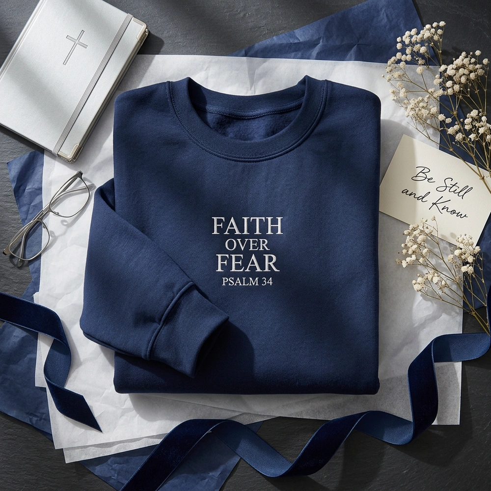 The Christian sweatshirt is a premium machine-embroidered garment featuring a minimalist Faith Over Fear design — a wearable reminder of Psalm 34.