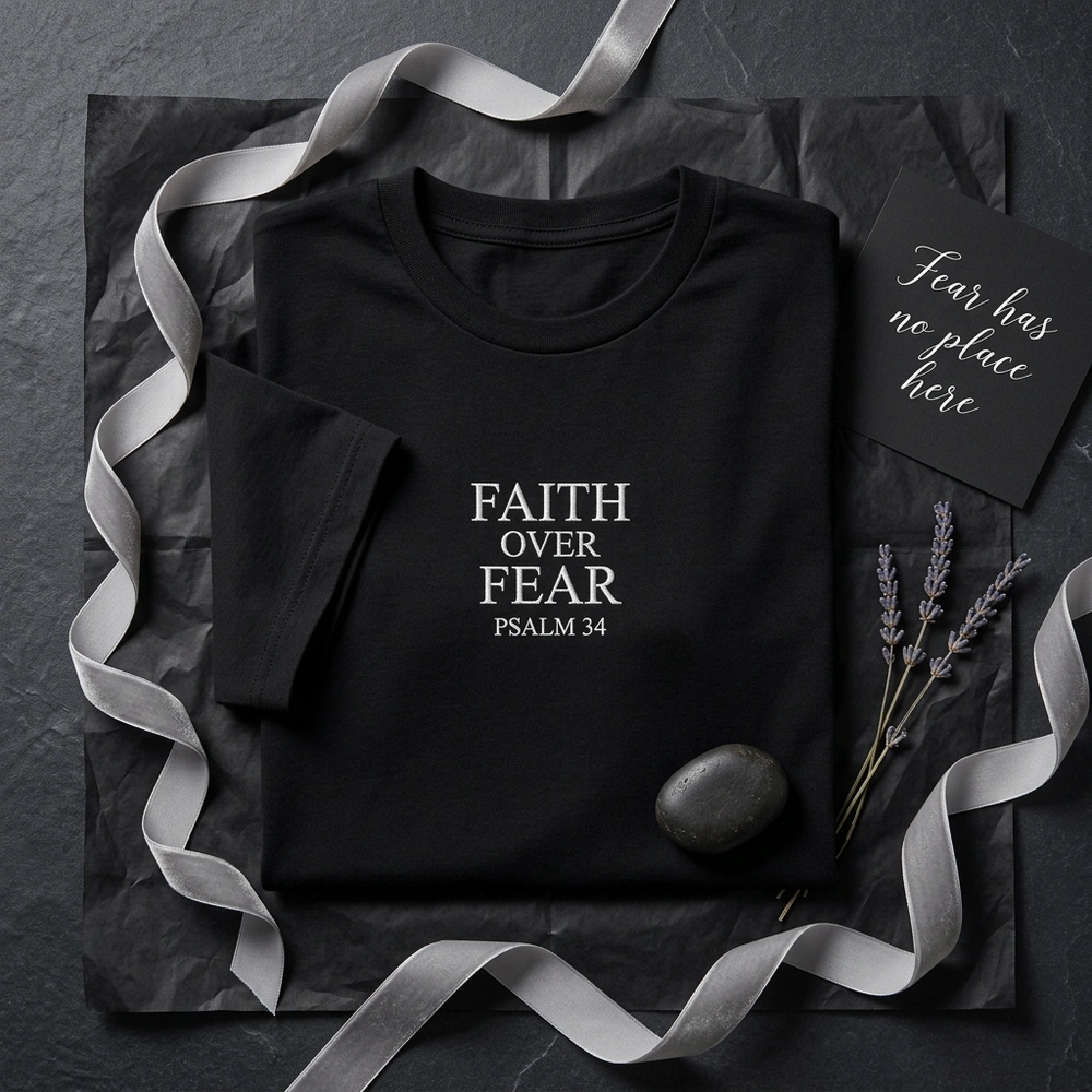 This exclusive design is meticulously crafted on a Blue Jean garment, providing a rich, vintage-inspired backdrop for the crisp white embroidery. The centered chest placement features “FAITH OVER FEAR” in a bold, modern sans-serif font, followed by the “PSALM 34” reference in a sleek, slightly smaller scale. Using a dense satin stitch with high-quality white thread, the embroidery measures 22cm x 7cm, creating a premium, raised texture that is both durable and visually striking. The clean linework ensures a contemporary look that bridges the gap between traditional Bible verse apparel and modern fashion.