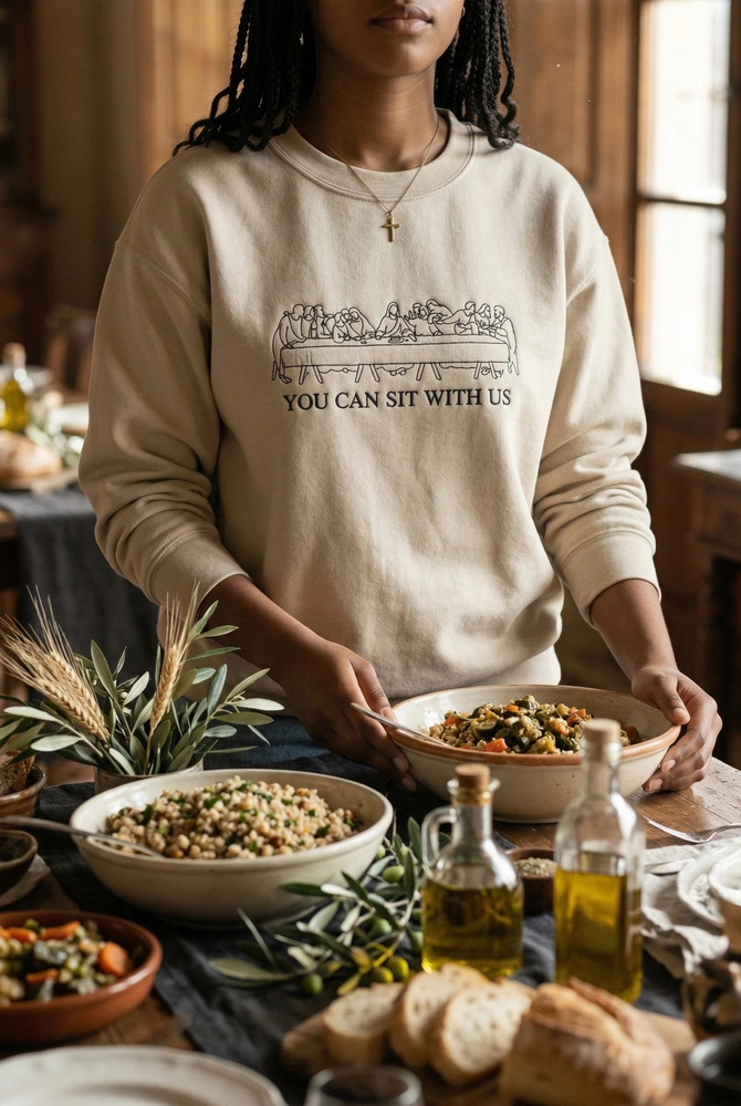 The Christian sweatshirt – Last Supper edition features a minimalist ‘You Can Sit With Us’ design, blending radical hospitality with modern, aesthetic faith.