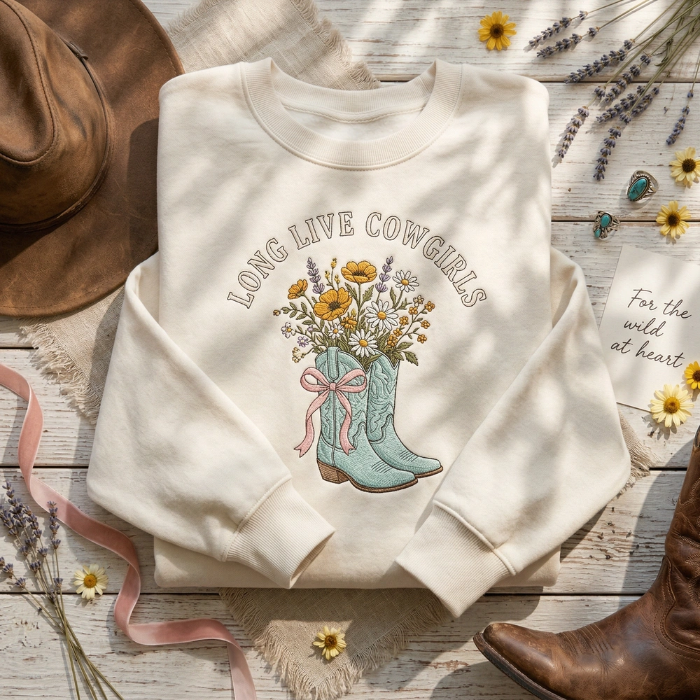 This intricate design is expertly crafted on a high-quality cream/off-white garment. The embroidery measures approximately 18cm x 15cm and utilizes 6 premium thread colors, including rustic brown, light teal, soft pink, and golden yellow. The centerpiece features light teal cowboy boots adorned with traditional stitching and a soft pink ribbon, complemented by a vibrant bouquet of wildflowers and a classic brown cowboy hat. The phrase “Long Live Cowgirls” is rendered in a vintage, outlined serif typography that arches perfectly around the illustration to create a cohesive, circular emblem feel.
