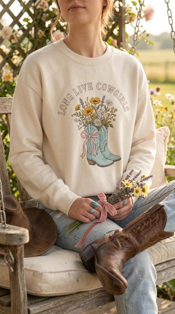 Embrace the trending western romance aesthetic with this beautifully detailed piece. Whether you are planning a Nashville bachelorette trip or looking for the ultimate country concert outfit, this sweatshirt blends rugged charm with soft, feminine floral accents. It is the ideal choice for those who love the romanticized country lifestyle and want to show off their unique style. Browse more embroidered sweatshirts in our collection to find your next favorite look.