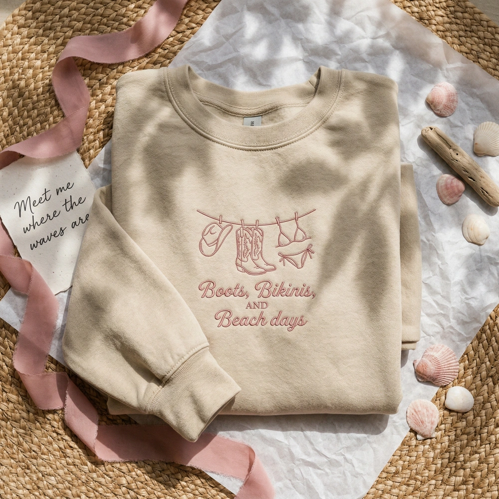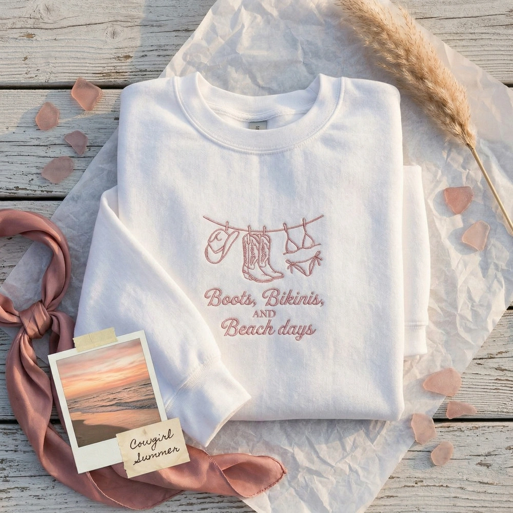 The Coastal Cowgirl Embroidered Sweatshirt features a dusty rose “Boots, Bikinis, and Beach Days” design, blending western charm with summer beach vibes.