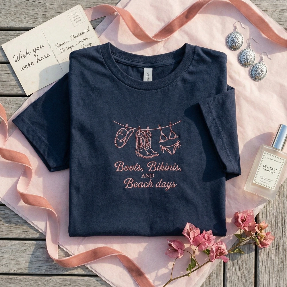 This design is expertly rendered in a single-color Dusty Rose (#E1989B) thread, creating a sophisticated monochromatic look against the crisp White garment. The embroidery measures 22cm x 16cm and features a whimsical script reading “Boots, Bikinis, AND Beach days.” Below the text, a delicate clothesline holds four detailed icons: a classic cowboy hat, tall cowboy boots with seashell embroidery, a string bikini bottom, and a seashell bikini top. Accents of a starfish and a dainty ribbon bow complete this high-detail, lightweight embroidery.