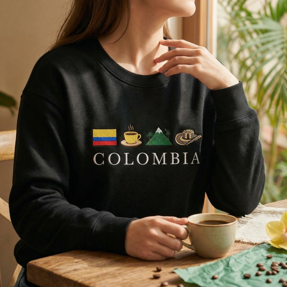 The Colombia sweatshirt is a premium machine-embroidered sweatshirt featuring the national flag, coffee culture icons, and the traditional sombrero vueltiao.