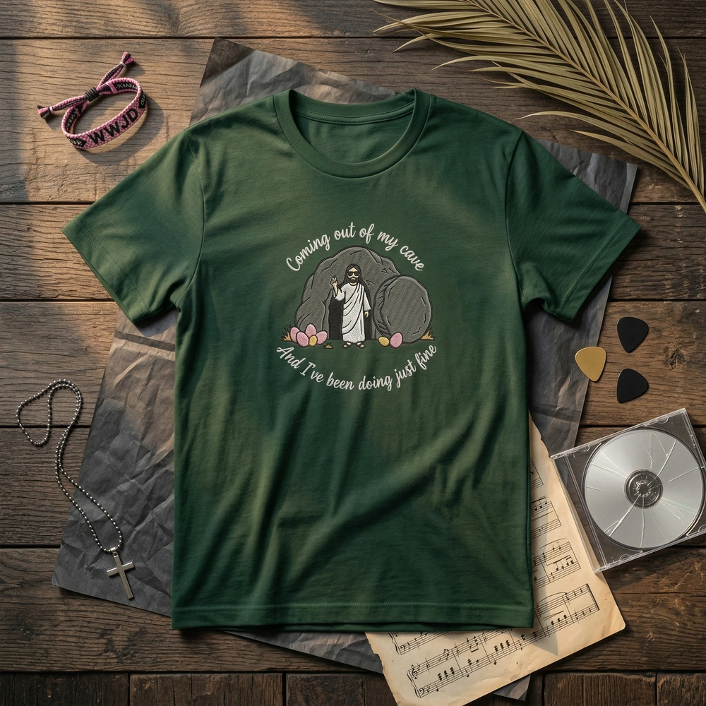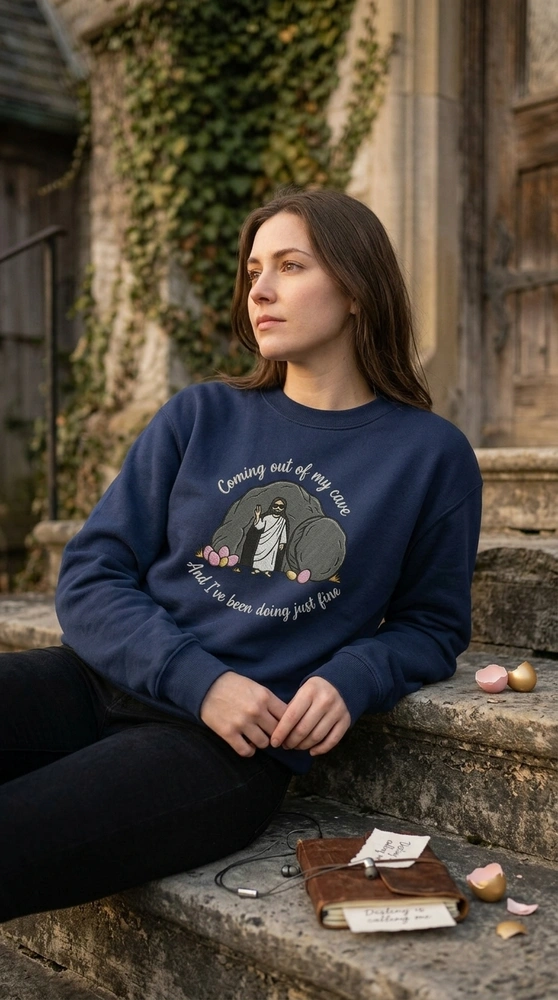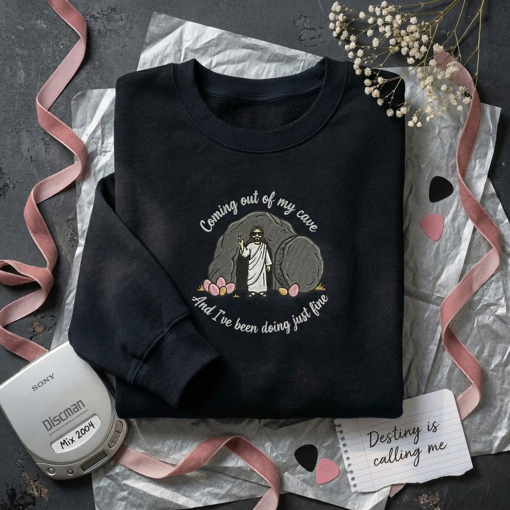 The Coming Out Of My Cave Jesus Embroidered Sweatshirt is a premium machine-embroidered top featuring a hilarious Mr. Brightside parody for Easter.