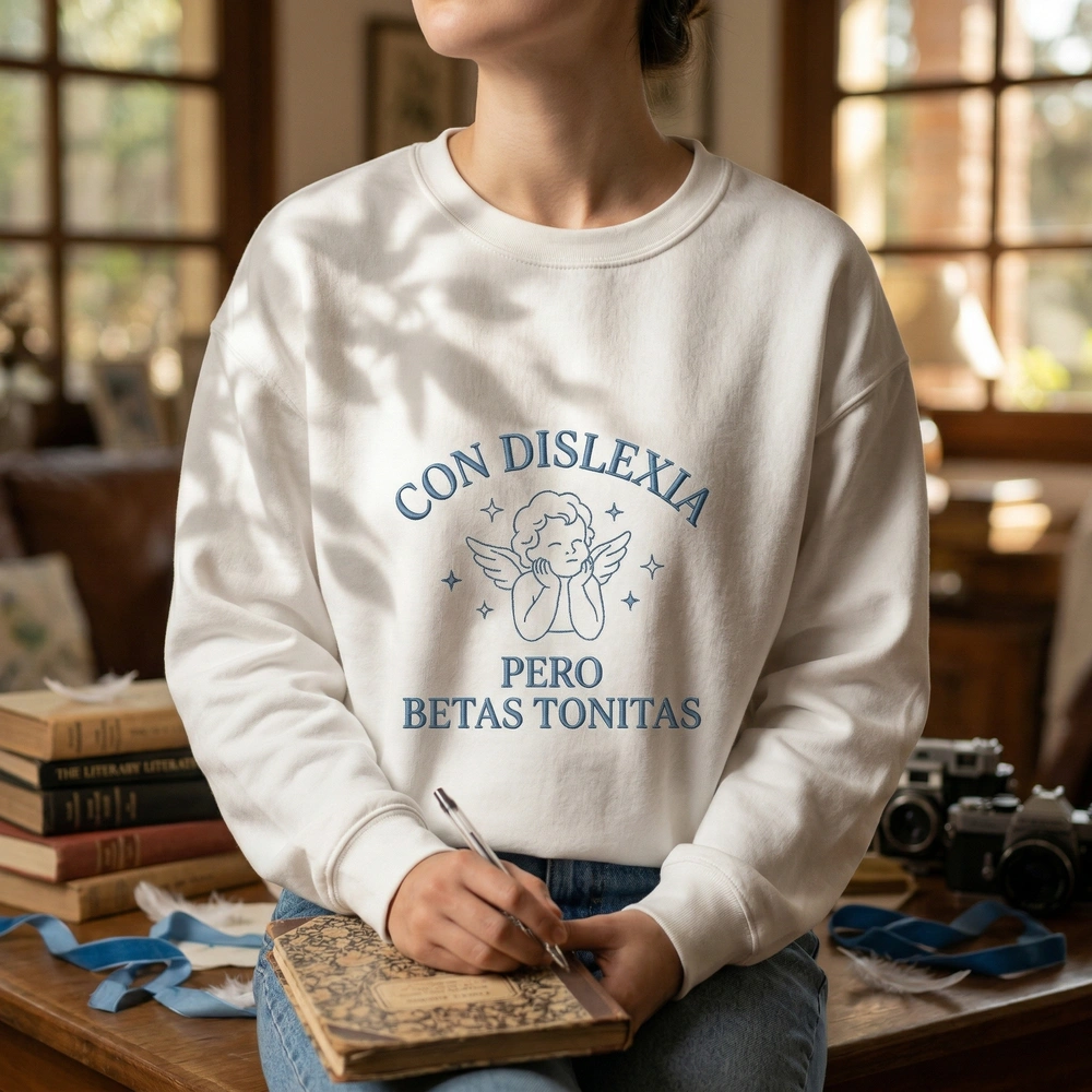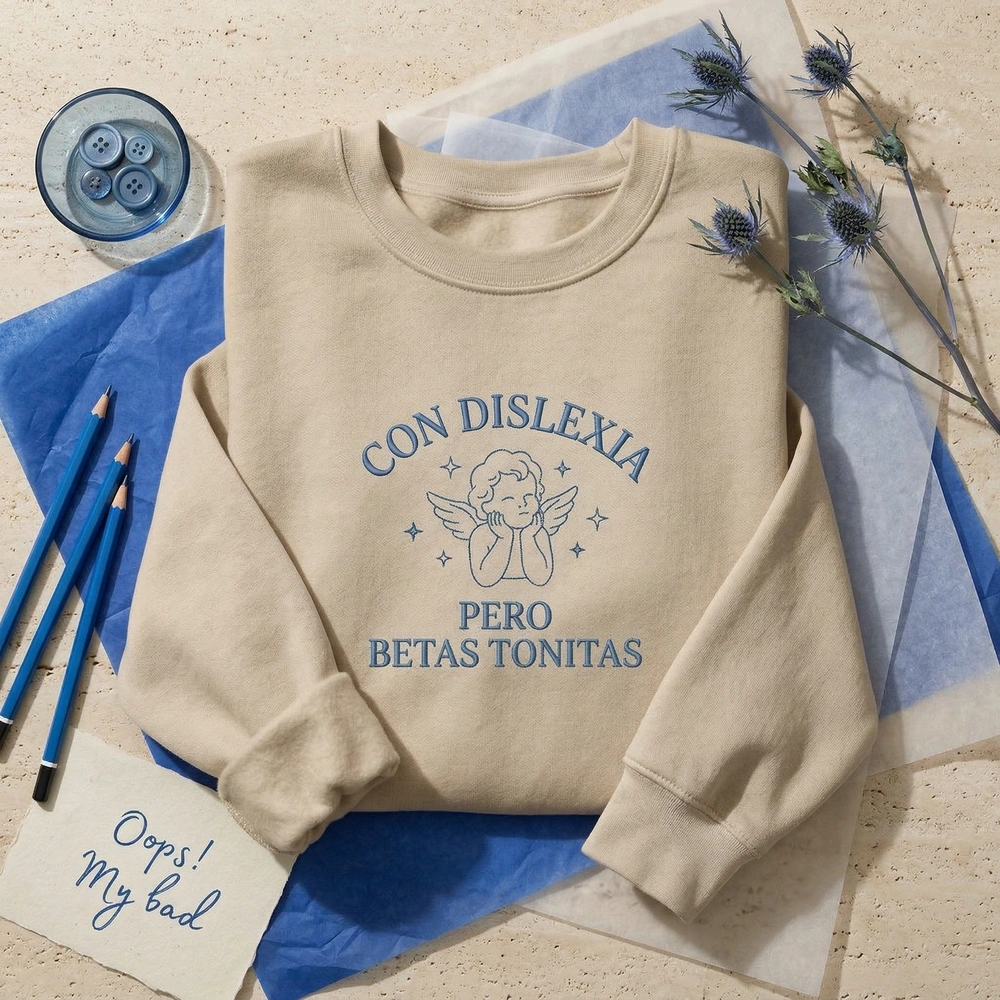 This design is expertly rendered on a premium white garment using high-quality medium-blue thread (#4A88D0). The center-chest embroidery measures approximately 18cm x 15cm. To ensure a premium feel, the bold serif text “CON DISLEXIA” and “PERO BETAS TONITAS” is executed with a dense satin stitch for a raised, tactile texture. In contrast, the minimalist line-art cherub and delicate four-point sparkle stars utilize a precise running stitch, maintaining fine detail without adding bulk to the fabric.