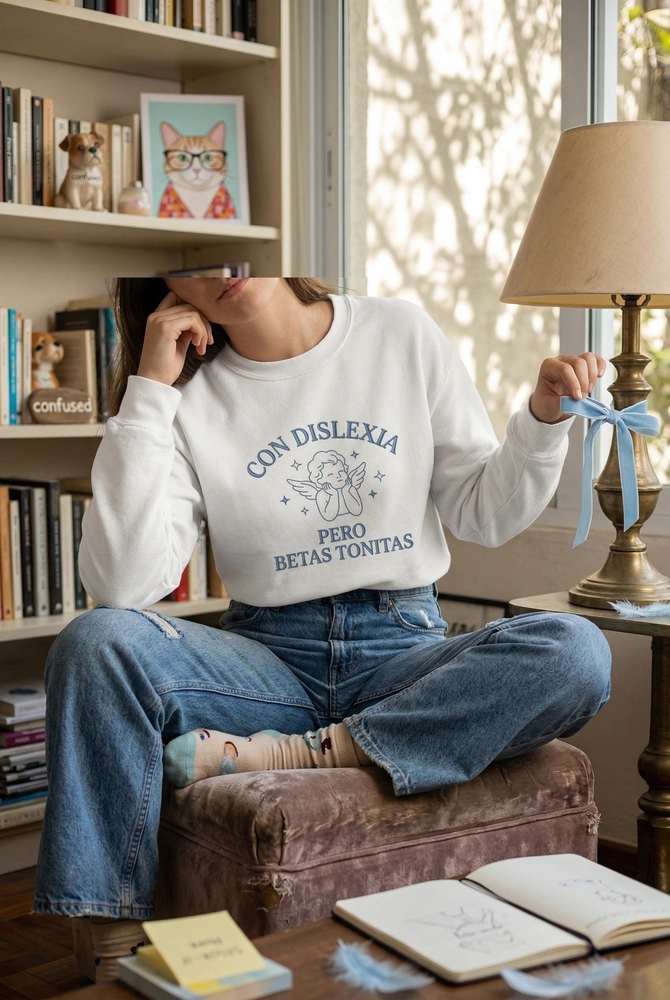 The design features a playful Spanish spoonerism (a play on “botas bonitas”). It is a popular internet meme that uses “Con Dislexia Pero Betas Tonitas” to humorously express a “no thoughts, just vibes” energy with a self-deprecating twist.