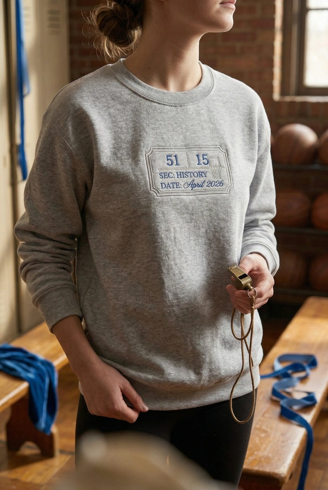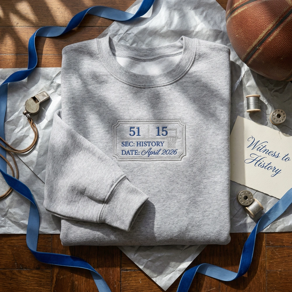The Cooper Flagg Embroidered Sweatshirt features a vintage ticket stub design, capturing the historic 51-point rookie milestone in stunning detail.