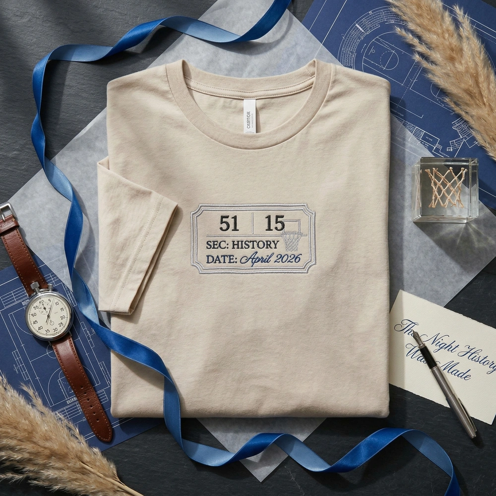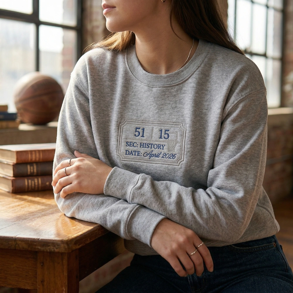 The “51 Point Rookie Ticket V2” is a masterclass in clean, high-detail embroidery. The left-chest design measures 10cm x 6cm and utilizes three premium thread colors: Dallas Blue (#00538C), Silver (#C4CED4), and Black. The silver-stitched ticket border frames the historic “51” and “15” numbers, while fine blue thread details the “SEC: HISTORY” and “DATE: APRIL 2026” text. A subtle basketball hoop watermark is integrated into the Sport Grey garment for a sophisticated, vintage look that feels like a wearable rookie card.