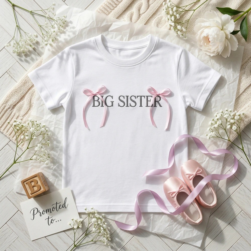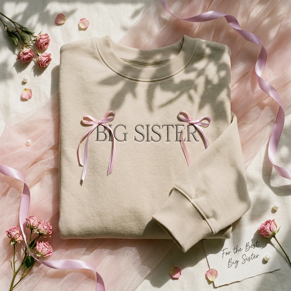 This design is meticulously machine-embroidered on a soft Sand garment, ensuring a high-quality finish that lasts through every playground adventure. The center chest features the words ‘BIG SISTER’ in a charcoal (#3A3A3A) thin serif font. Two delicate pink bows, rendered in Light Pink (#FFB6C1) and Pale Violet Red (#DB7093) thread, rest on the corners of the text with flowing tails. The embroidery measures approximately 15cm x 8cm and utilizes three premium thread colors for a dimensional, textured look.