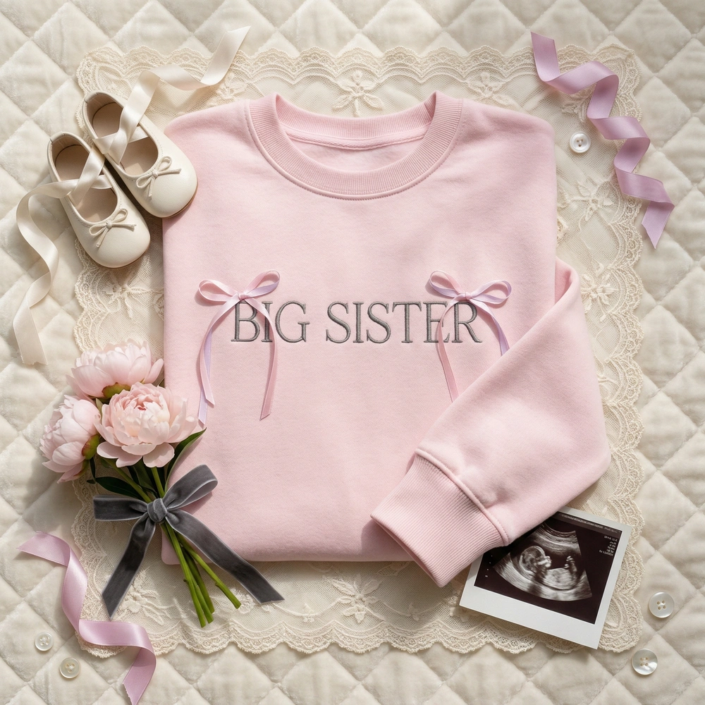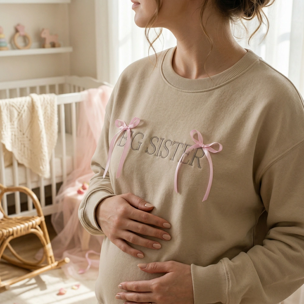 Designed for the modern millennial mom, this piece turns your pregnancy announcement into a high-end boutique photo moment. Whether you are planning a professional photoshoot or a casual social media reveal, this aesthetic sibling shirt captures the popular coquette trend with its soft palette and minimalist vibe. Browse more embroidered sweatshirts and our signature mama sweatshirt collection to find matching styles for the whole family.