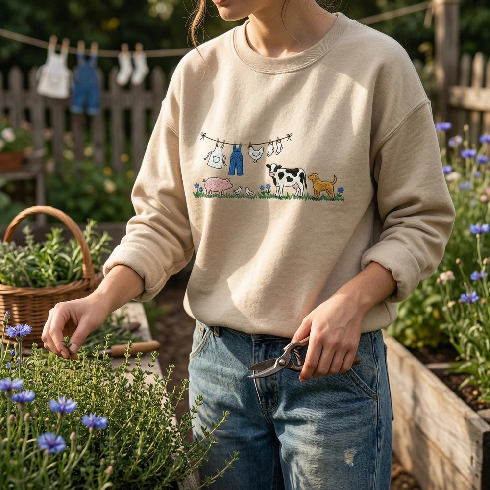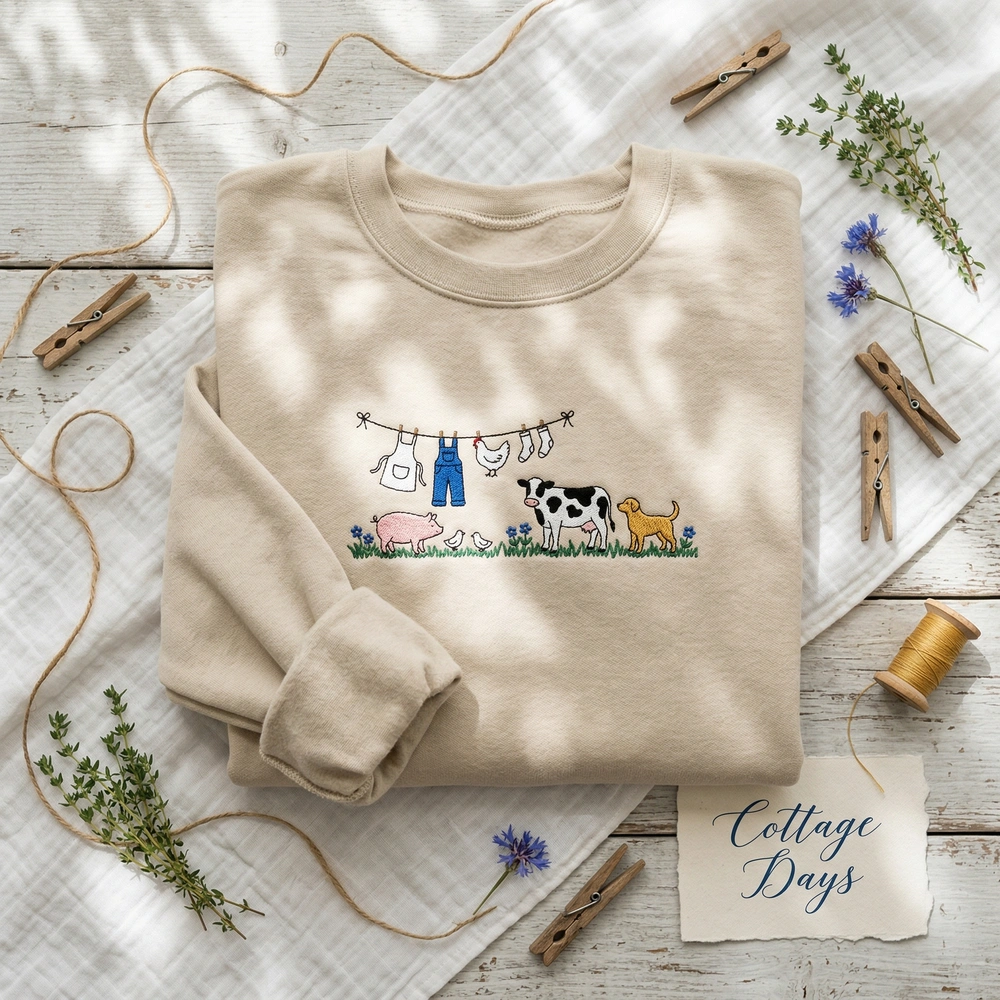 The Cottagecore Embroidered Sweatshirt features a whimsical farm animal clothesline design, making it the ultimate farm animal gift for homesteading fans.