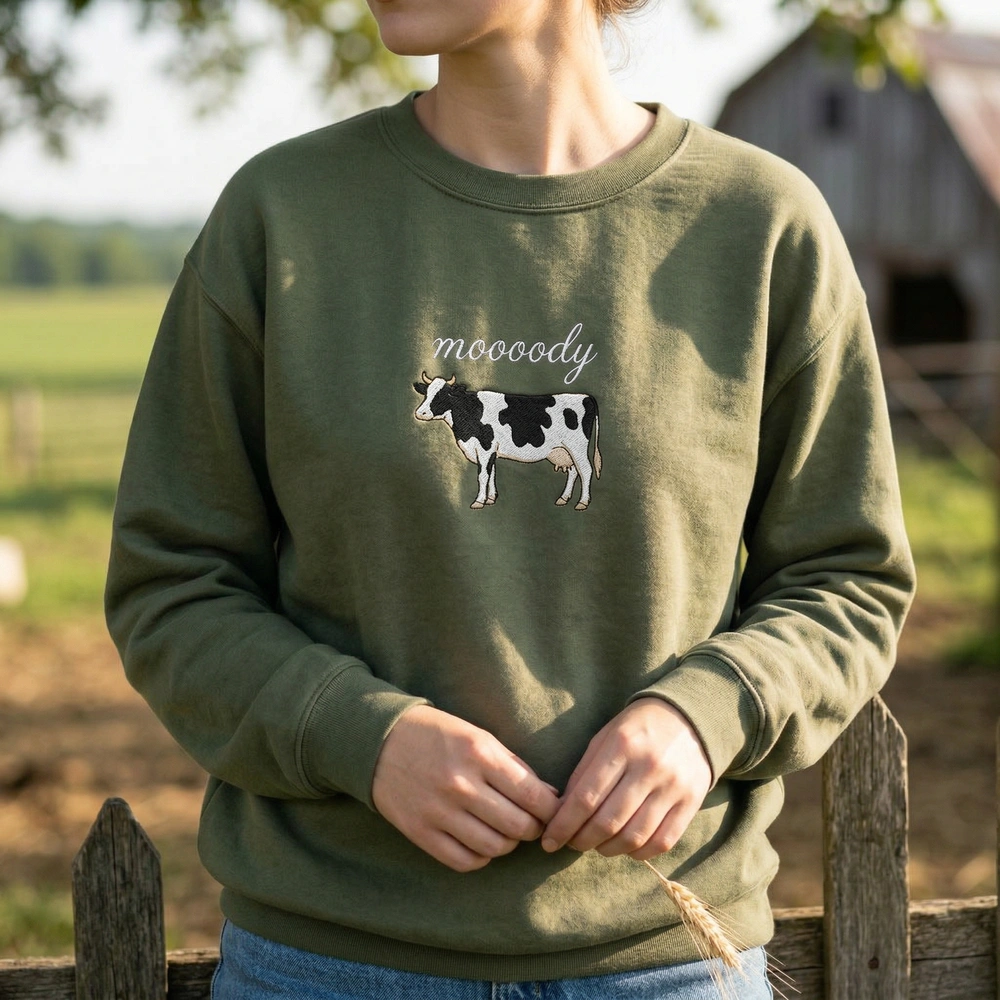 This original design is brought to life through high-density machine embroidery on a rich Military Green garment. The center-chest piece features a classic Holstein dairy cow in profile, rendered with stark black and white spotted coat textures. We use subtle light tan thread for the hooves, horns, and udder to add realistic depth. Arched above the cow is the word ‘MOOOODY’ in a thick, white satin stitch that mimics handwritten script. The design measures approximately 12cm x 9cm, using a premium 3-color palette that pops against the earthy green background, making it a staple for any cottagecore or farmcore wardrobe.