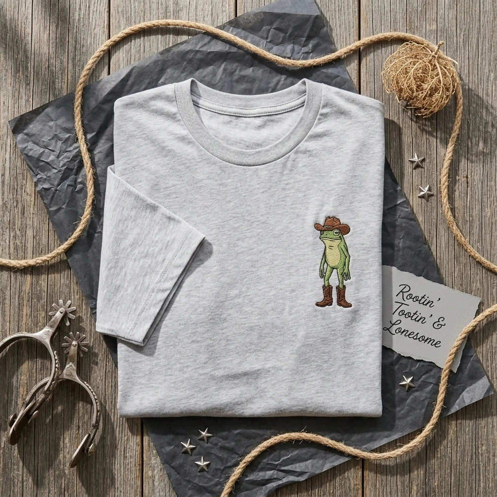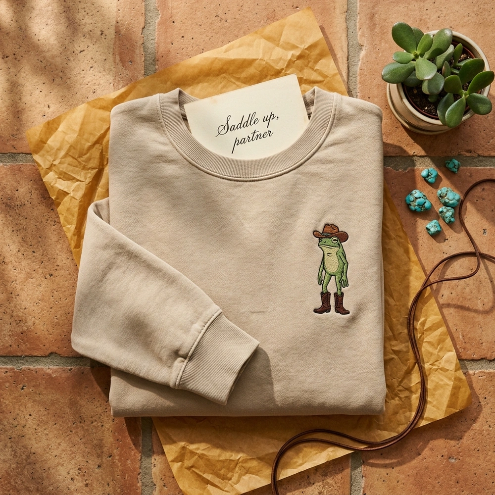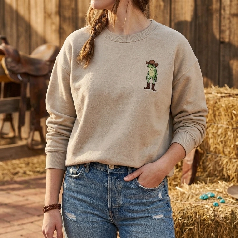 The Cowboy Frog Embroidered Sweatshirt is a premium machine-embroidered top featuring a lanky lonesome frog in a yeehaw hat — perfect for meme fans.
