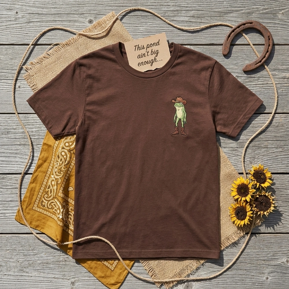 This design is an original illustration inspired by the ‘frogcore’ and ‘weirdcore’ internet subcultures, specifically the popular ‘cowboy frog’ motifs found across TikTok and Pinterest. It celebrates the absurd and whimsical nature of modern meme culture.