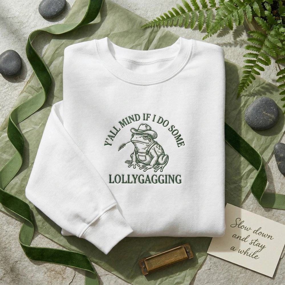 This design is inspired by the popular “Y’all mind if I do some lollygagging” internet meme trope, which combines western “yee-haw” energy with the laid-back, humorous frogcore aesthetic.