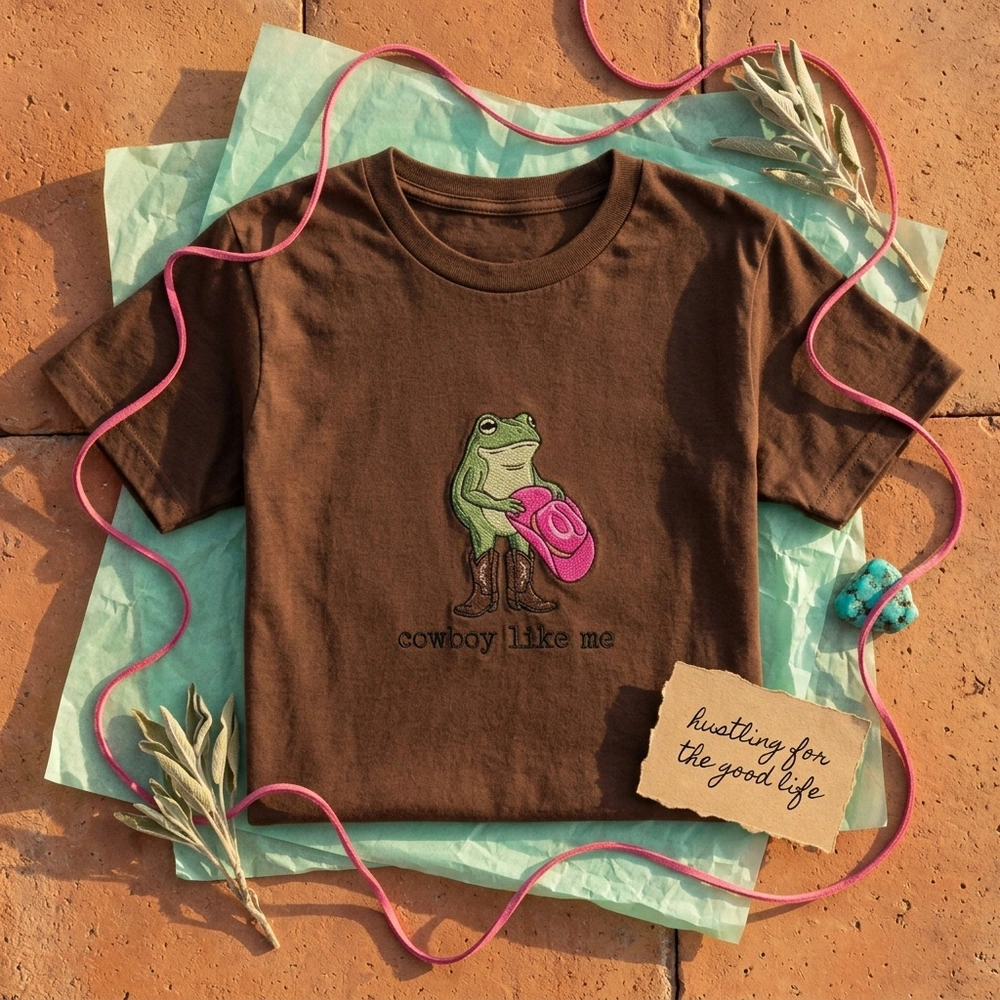 This exclusive design is meticulously rendered with over 12,000 stitches to ensure a durable and high-definition finish. The center-chest embroidery measures 10cm x 12cm and features a stylized green frog standing upright in a confident pose. The color palette includes Apple Green and Mint Green for the frog, Dark Brown for the heart-detailed boots, and a vibrant Hot Pink for the iconic cowboy hat. Set against a classic Sand garment color, the typewriter-style serif font is embroidered in solid black thread for a vintage look.