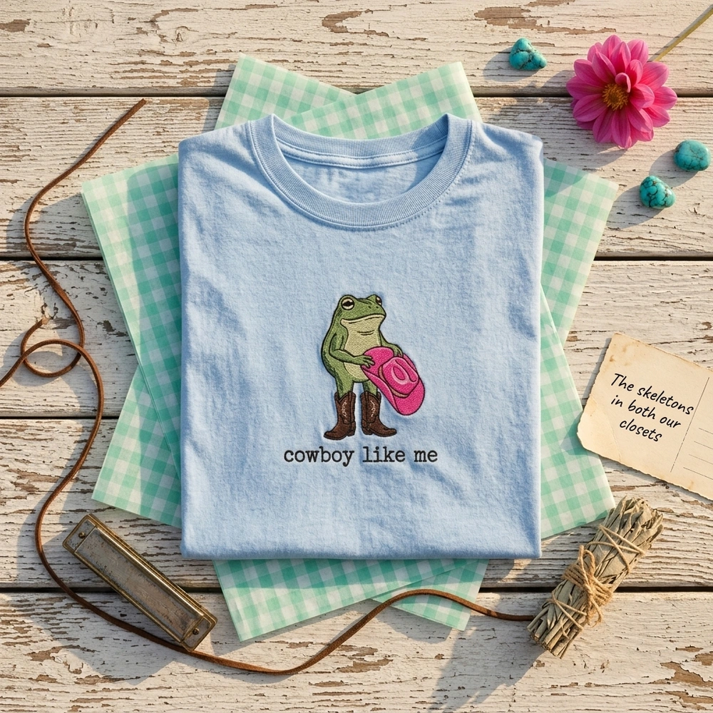 The Cowboy Like Me Embroidered Sweatshirt is a premium machine-embroidered top featuring a whimsical western frog—perfect for fans of indie pop lyrics.