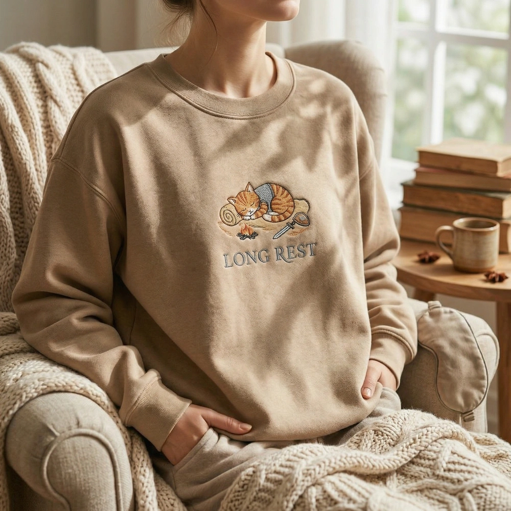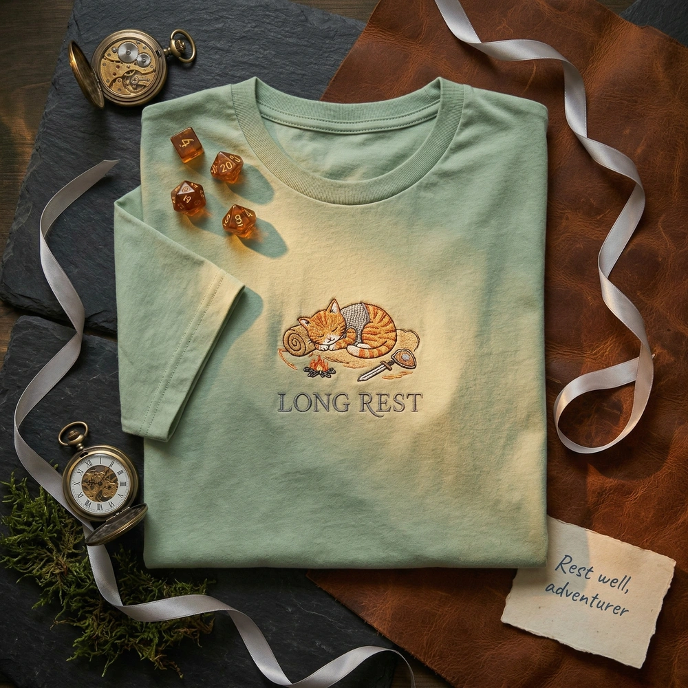 This intricate design measures 15cm x 14cm and is rendered using 5 high-quality thread colors, including Orange Tabby, Chainmail Silver, and Ember Orange. The artwork depicts a small cartoon cat in a loosened chainmail vest, curled in a perfect circle on a bedroll. Details like the dying campfire embers, thin wisps of smoke, and neatly set-aside sword and shield bring the RPG theme to life. The “LONG REST” text is embroidered in a warm, soft serif font on a Sandstone garment, creating a harmonious, earthy aesthetic that fits any cottagecore wardrobe.