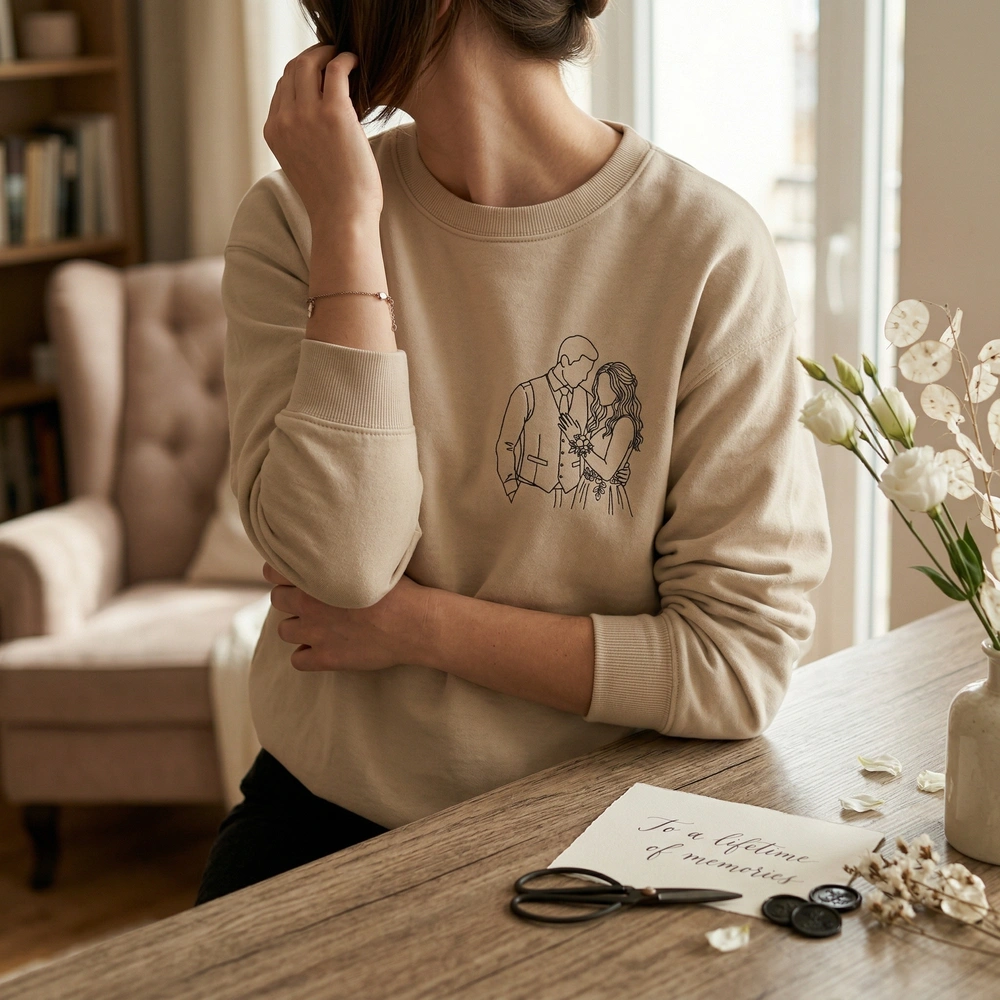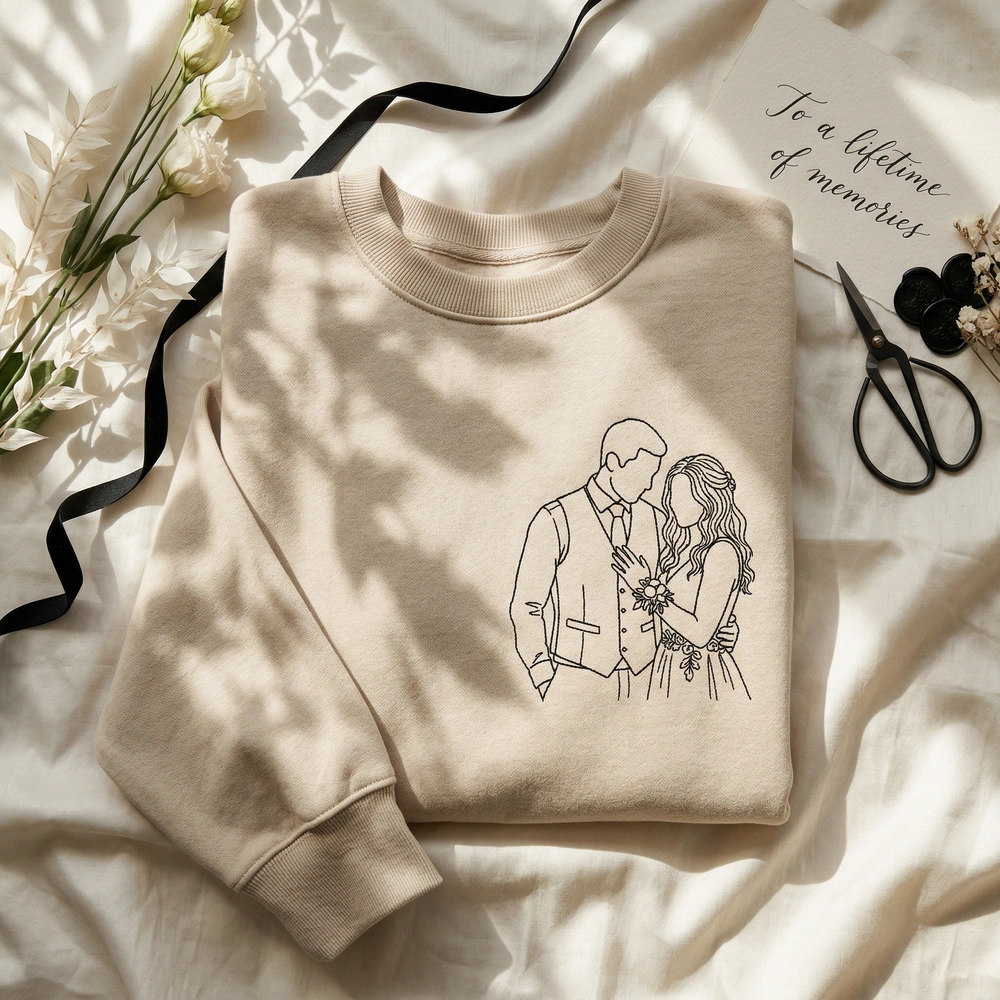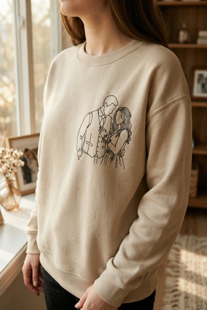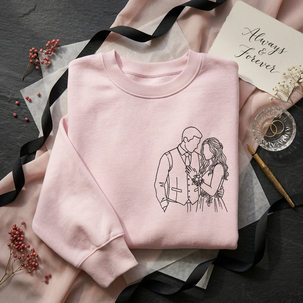 Transform your most cherished memory into a timeless, wearable piece of art that keeps your favorite person close to your heart. Whether it’s a snapshot from your wedding day or a favorite prom memory, our custom couple portrait captures the emotional connection of your relationship in a sophisticated, modern style. This piece is a standout among our embroidered sweatshirts and makes a thoughtful bride sweatshirt for those celebrating their new chapter.