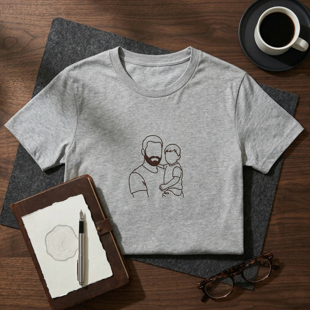 High-resolution photos with clear lighting and distinct silhouettes work best. While we simplify the linework for the embroidery process, choosing a photo with clear subjects (like the father and child silhouette in this design) ensures the best likeness in the final custom outline.
