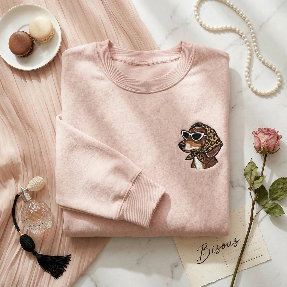 The Dachshund Embroidered Sweatshirt is a premium machine-embroidered top featuring a stylish wiener dog in a chic babushka scarf and sunglasses—the ultimate gift.