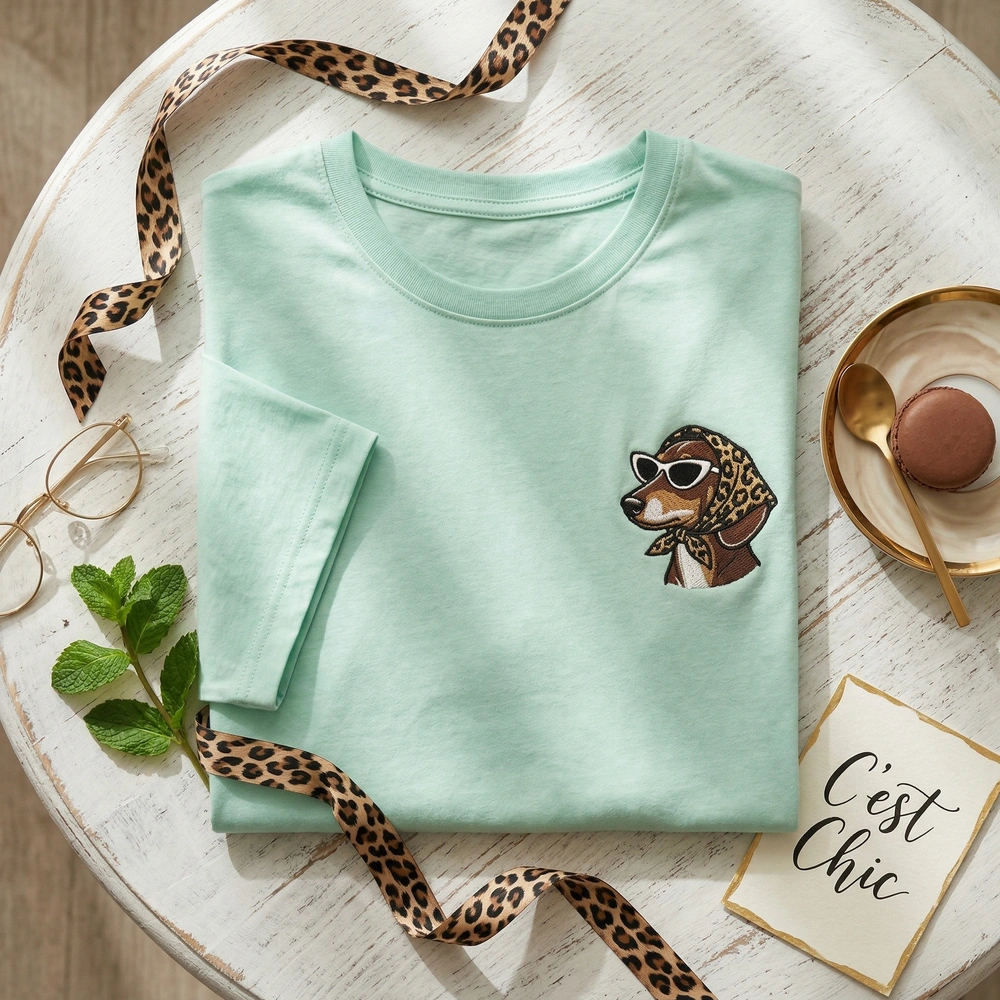 Our expert embroidery team uses high-density satin stitching to bring this chic dog design to life. The dachshund silhouette features clean, bold linework in dark brown and tan, while the leopard print headscarf is intricately detailed with five distinct thread colors (Dark Brown, Tan, Black, White, and Beige). The embroidery measures approximately 10cm x 12cm and is optimized for center-chest placement. Every garment is made to order, ensuring the highest quality finish for your sausage dog sweater.