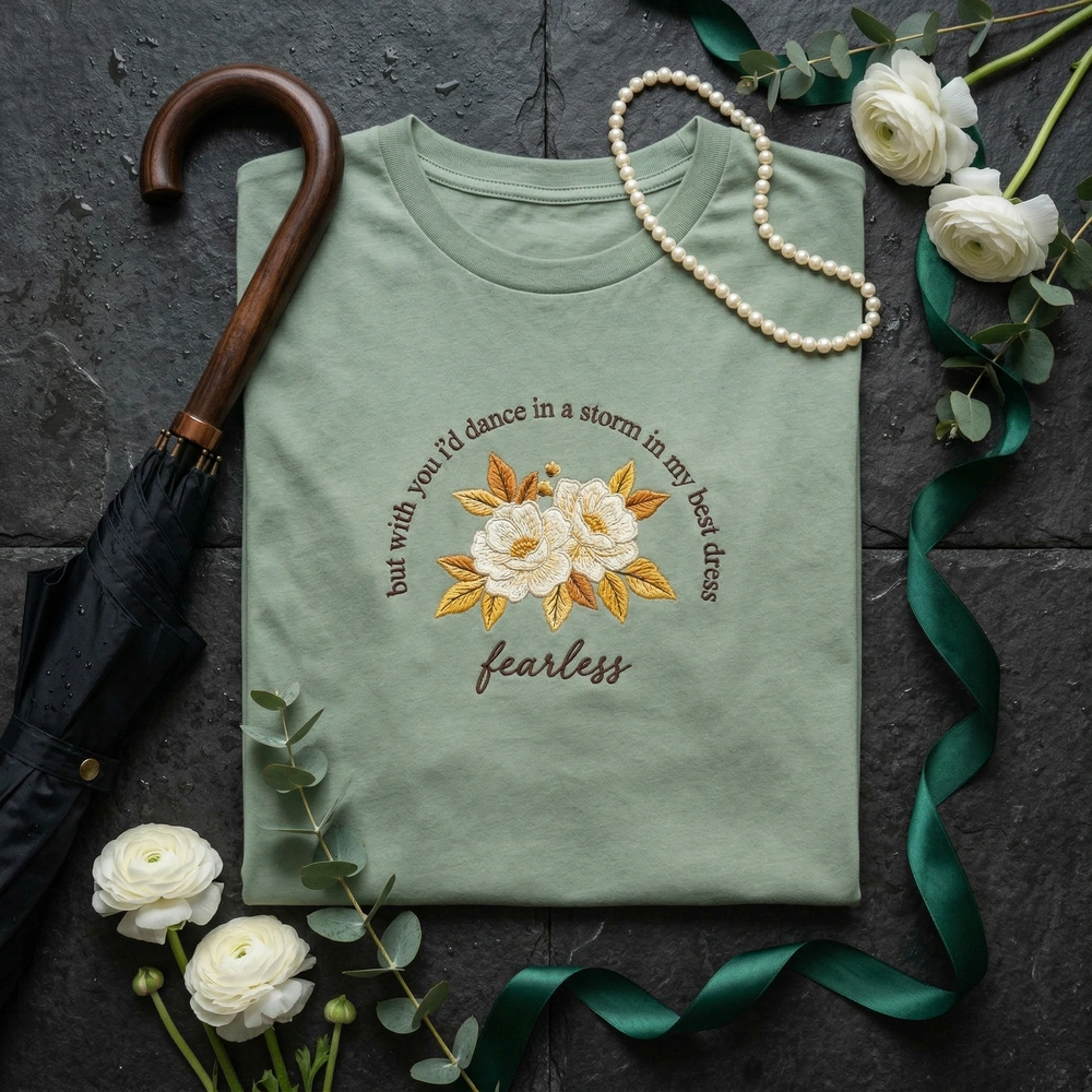 This intricate design measures 15cm x 18cm and features a sophisticated palette of dark brown, saffron yellow, and marigold threads. The centerpiece consists of two layered blossoms with creamy white petals and golden-yellow leaves, stitched with a mix of high-density satin and outline techniques for a textured, high-end feel. Arched gracefully above the floral arrangement is the classic lyric ‘but with you i’d dance in a storm in my best dress’ in a clean serif font, while the word ‘fearless’ is elegantly scripted below. Available on premium cream, sand, or light beige garments, this design utilizes 4 distinct thread colors to achieve its warm, nostalgic aesthetic.