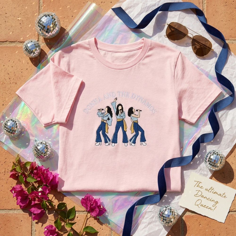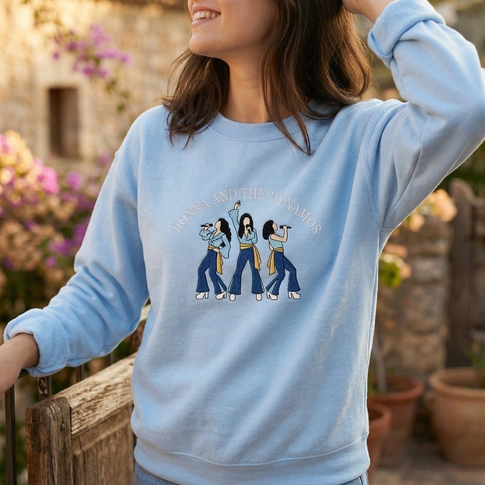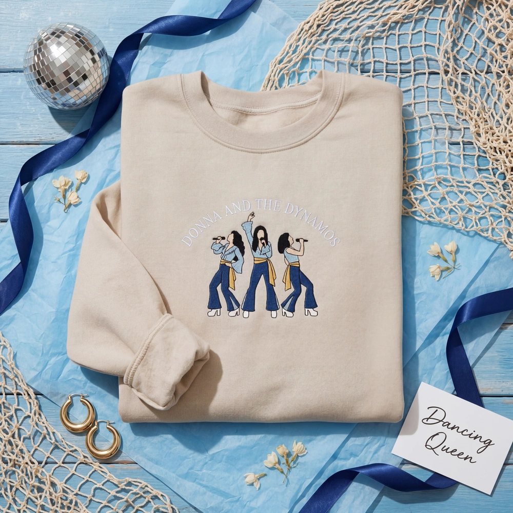 The Dancing Queen Embroidered Sweatshirt is a premium machine-embroidered top featuring a vibrant 70s disco girl group design—perfect for musical theater fans.