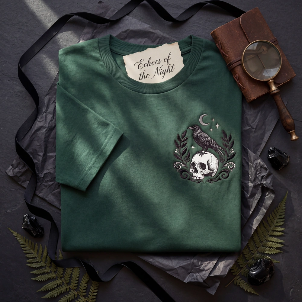 This design is an original artistic interpretation inspired by the mood of gothic literature and the dark academia aesthetic, specifically referencing the atmosphere found in works like Edgar Allan Poe’s ‘The Raven’.