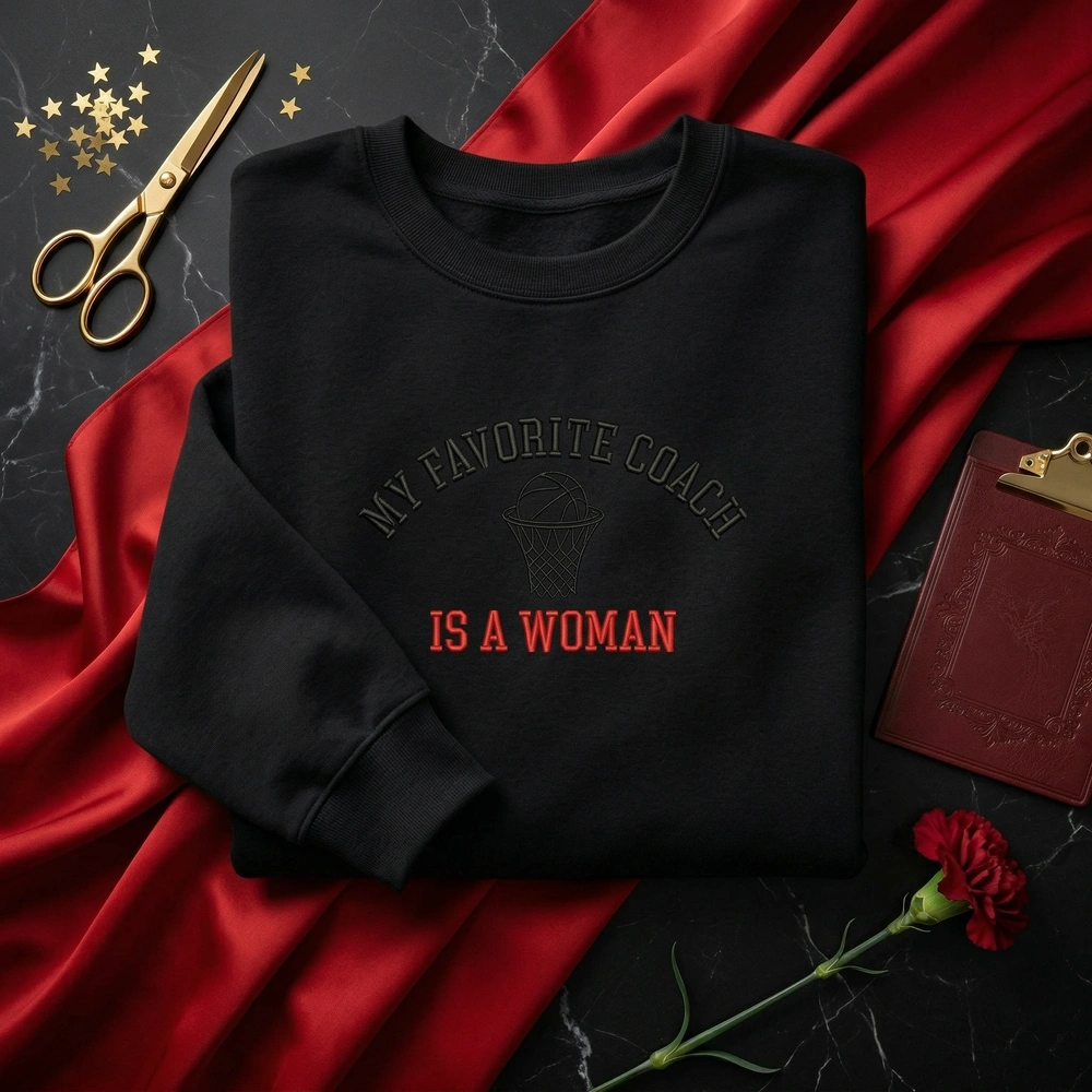 This design is meticulously crafted on a premium Sport Grey garment, ensuring both comfort and durability. The “MY FAVORITE COACH” text is rendered in a thick, retro 90s serif font using heavy satin stitching for a raised, high-end feel. This arches elegantly over a minimalist line-art basketball net, which is detailed with a delicate chain-stitch for visual contrast. The finishing touch is the bold “IS A WOMAN” block lettering below. The entire embroidery measures approximately 22cm x 15cm and utilizes a high-density 2-color thread palette of deep Black and Varsity Red (#D32F2F).