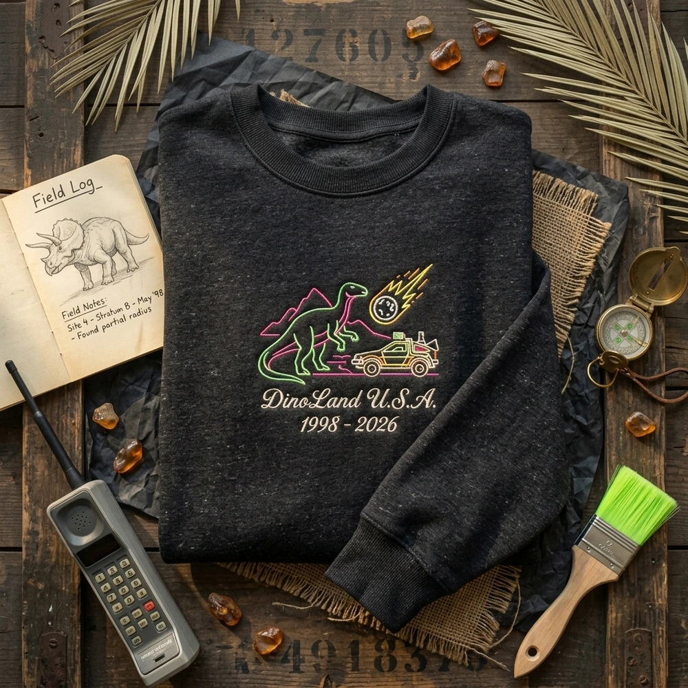 The DinoLand USA Embroidered Sweatshirt is a premium machine-embroidered top featuring the 1998-2026 extinct dinosaur ride design — a must-have for fans.