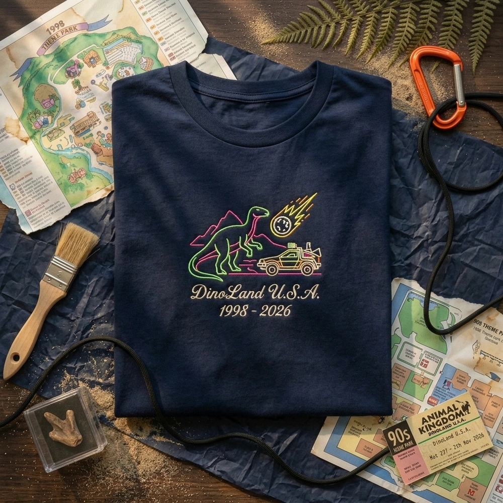 Celebrate the legacy of Animal Kingdom 2026 closures with this high-quality tribute to the legendary Iguanodon and Time Rover. This design is perfect for the Disney adult who treats every park visit like a journey through time and wants to wear their nostalgia as a badge of honor. Whether you are park hopping or reminiscing at home, this piece connects you to the golden era of theme park history. Browse more embroidered sweatshirts in our collection to find your next favorite park outfit.