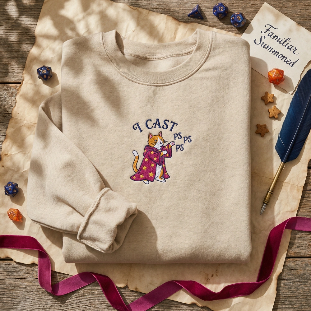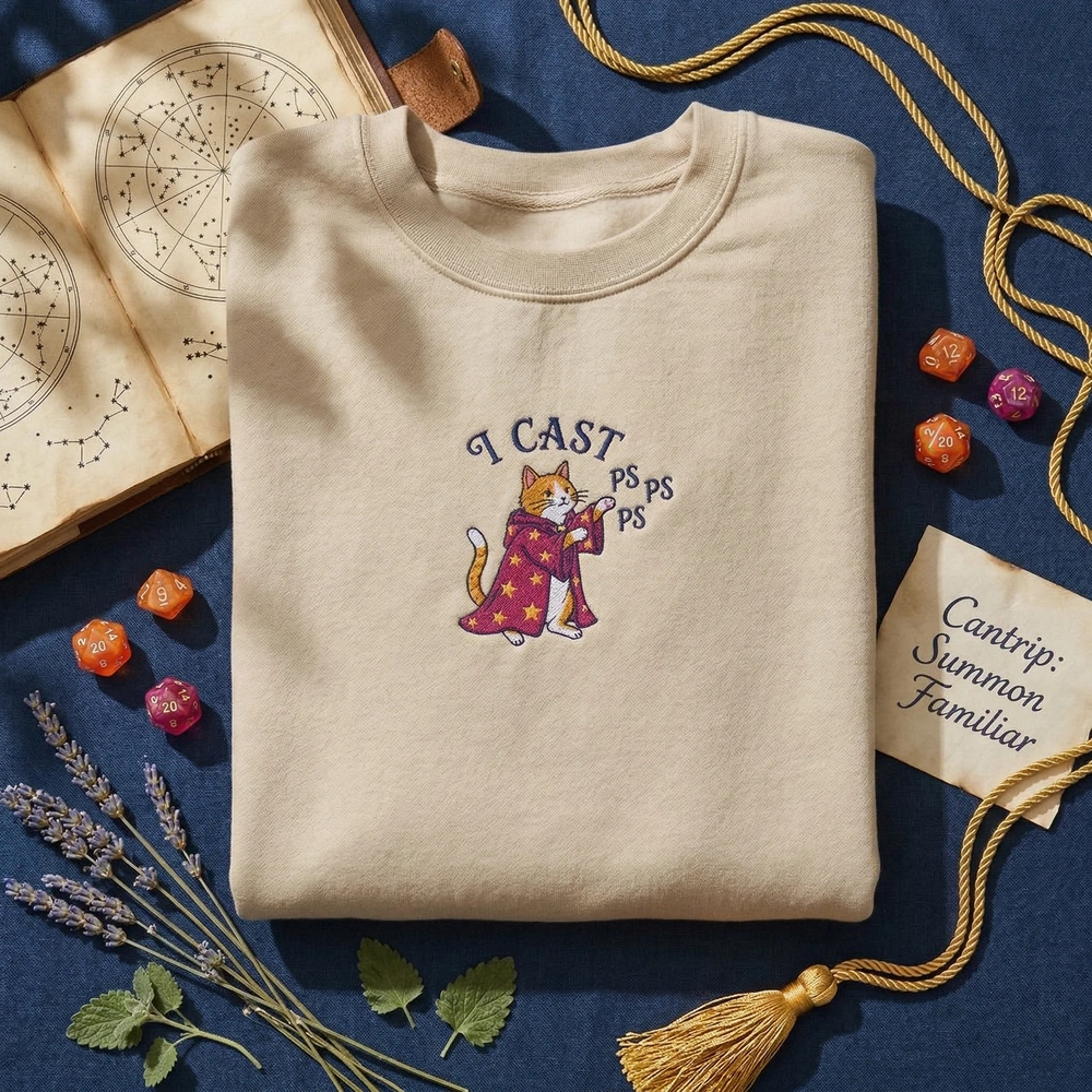 This humorous design blends the chaotic energy of a tabletop roleplaying session with the relatable struggle of summoning your feline familiar. Whether you are a dedicated Dungeon Master or a casual player, this high-quality embroidery piece creates an instant emotional connection for those who live at the intersection of fantasy gaming and pet ownership. It is the perfect conversation starter for your next campaign night. Browse more embroidered sweatshirts in our collection to find your next favorite gaming apparel.