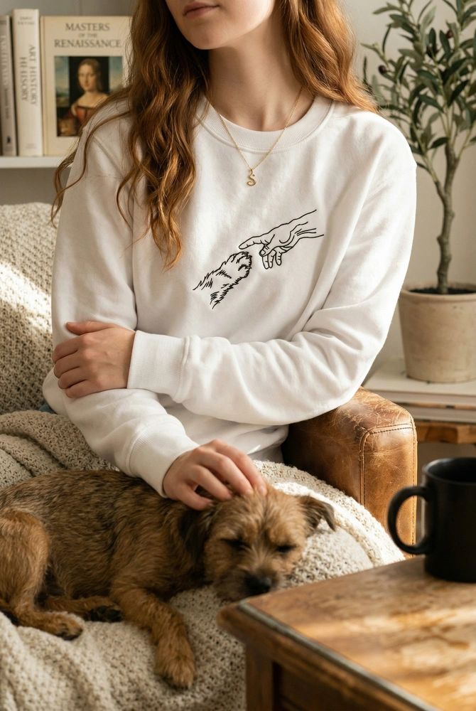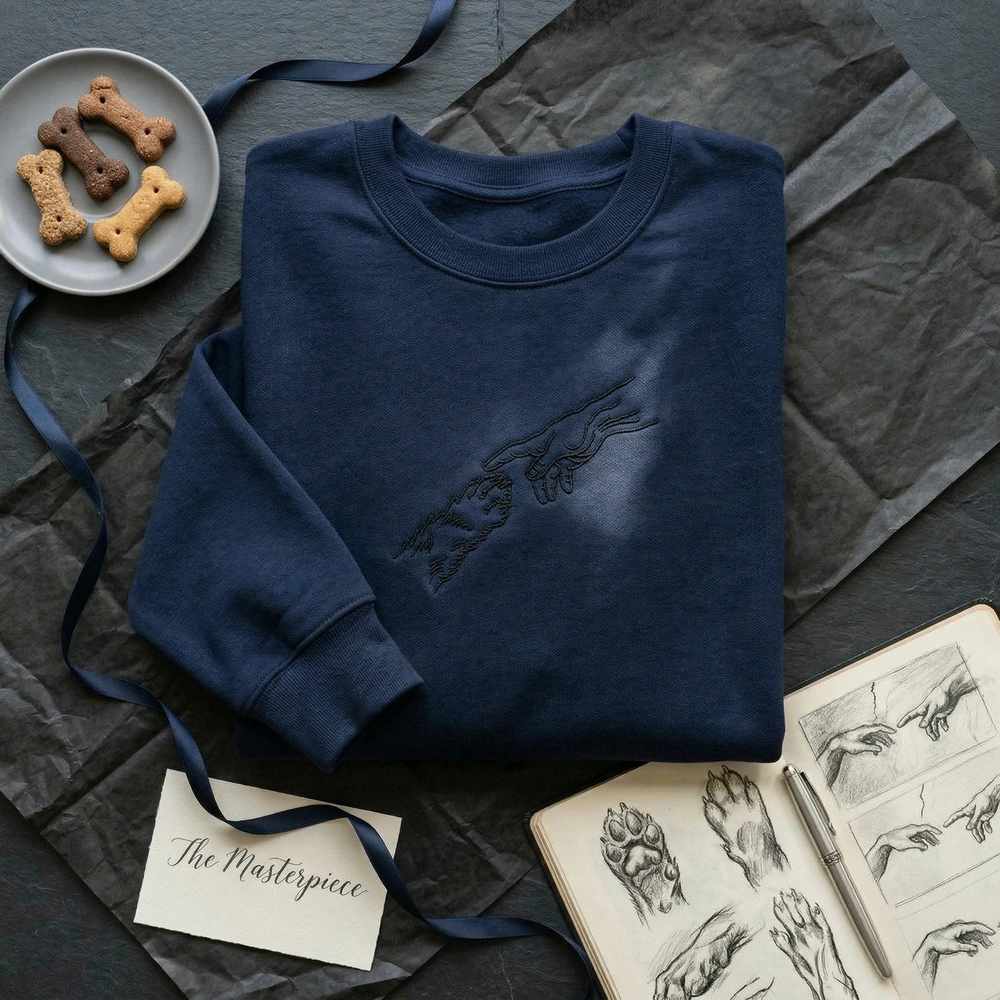 Celebrate the divine bond between you and your furry best friend with this sophisticated piece of wearable art. Designed for the modern pet parent who appreciates a clever cultural reference, this garment bridges the gap between high-art history and everyday animal devotion. Whether you are a proud rescue advocate or a dedicated cat dad, this design serves as a subtle yet powerful conversation starter. Browse more embroidered sweatshirts in our collection to find your perfect match.