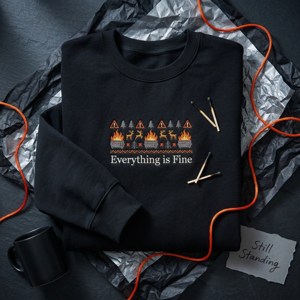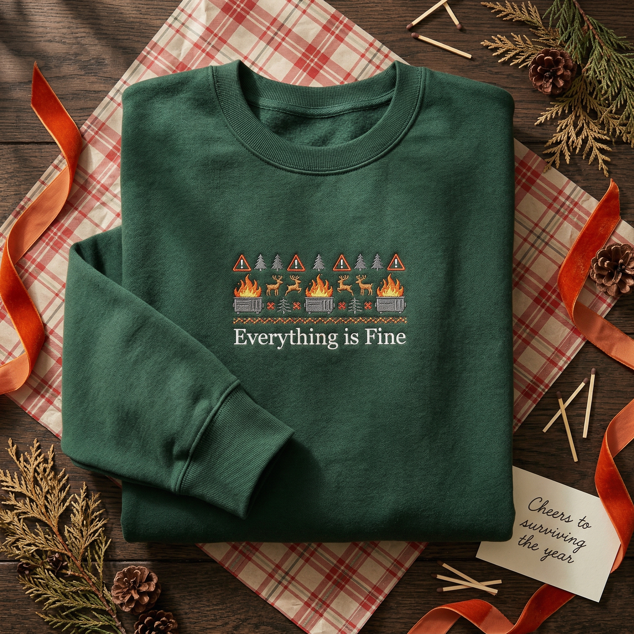 The Dumpster Fire Ugly Christmas Sweater Embroidered Sweatshirt is a premium holiday top featuring a pixel-art ‘Everything Is Fine’ meme design.