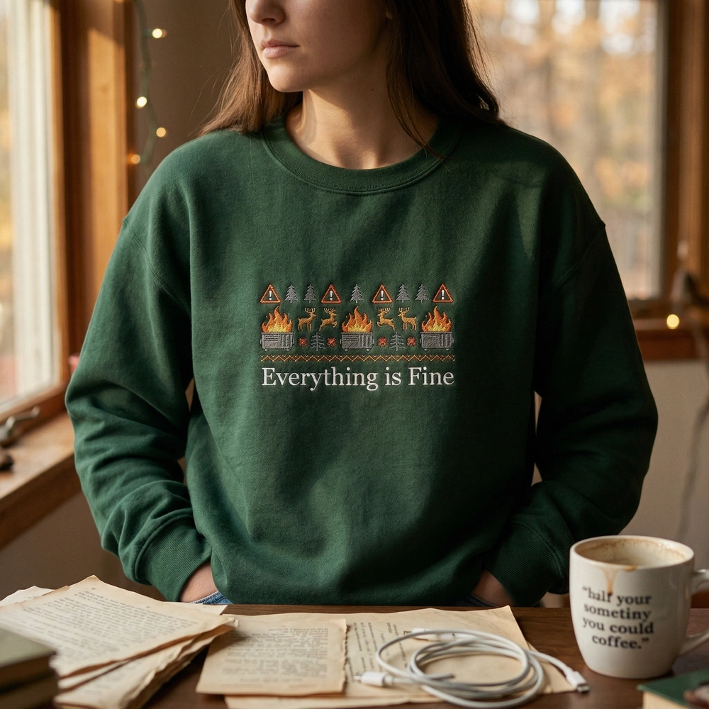This original design features a highly structured, horizontal Fair Isle pattern that swaps traditional reindeer for neatly repeating rows of pixelated dumpsters on fire. Each dumpster is flanked by concerned-looking pixel reindeer, creating a hilarious juxtaposition. The text ‘EVERYTHING IS FINE’ is seamlessly integrated into the pixel-block knit pattern at the bottom. The embroidery measures a substantial 24cm x 14cm and utilizes five vibrant thread colors: Snow White, Fire Orange, Flame Yellow, Knit Red, and Dumpster Grey. The high-density stitching creates a tactile, premium feel on a cozy Forest Green garment.