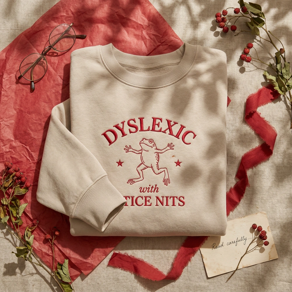 This exclusive design features a striking single-color embroidery in Vintage Red (#C8102E) that pops against the neutral Sand garment. The centerpiece is a 15cm wide composition featuring a bold, arched “DYSLEXIC” serif font in a dense satin stitch. Below the text sits a charming line-art frog standing on its hind legs, rendered in clean running stitches and flanked by delicate four-point stars. The punchline “with TICE NITS” is stitched in matching red typography at the base. This high-stitch-count design ensures durability and a premium tactile feel that screen printing simply cannot match.