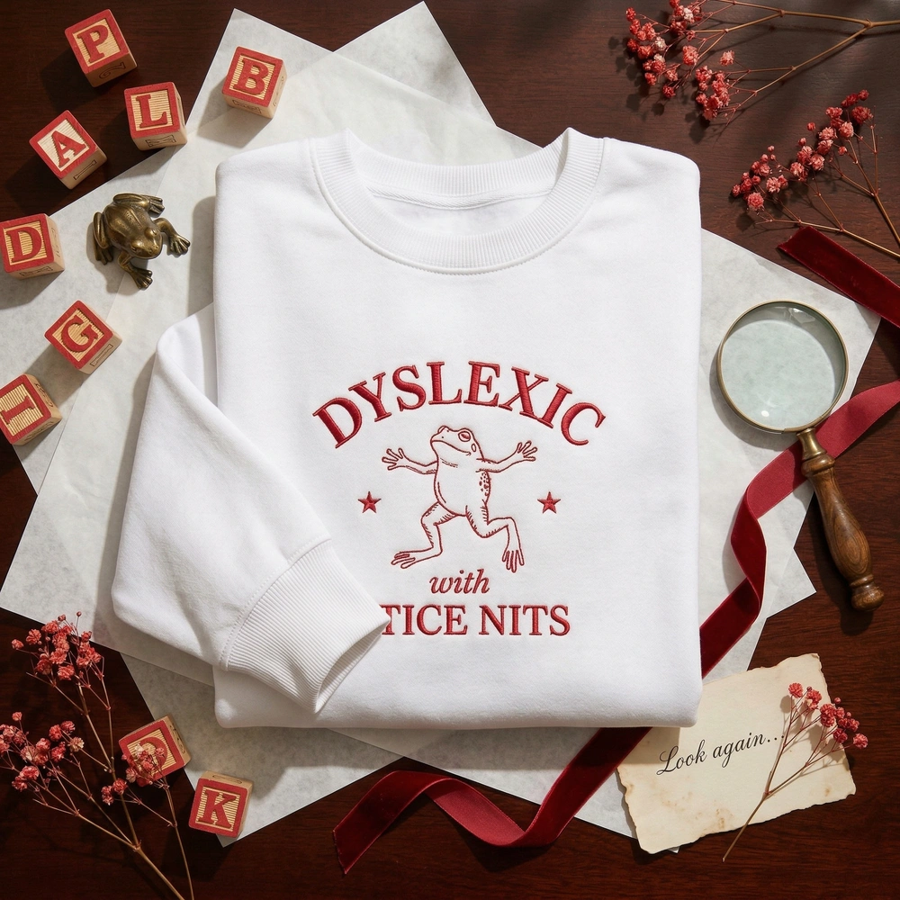 The Dyslexic with Tice Nits Embroidered Sweatshirt is a premium machine-embroidered garment featuring a funny frog design and ironic, high-contrast typography.