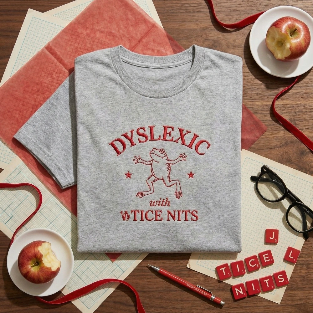 It is a playful spoonerism of “Nice Tits,” designed as a humorous nod to the word-scrambling nature of dyslexia. It’s meant to be lighthearted, ironic, and a bit of a “double-take” design for those who read it closely.