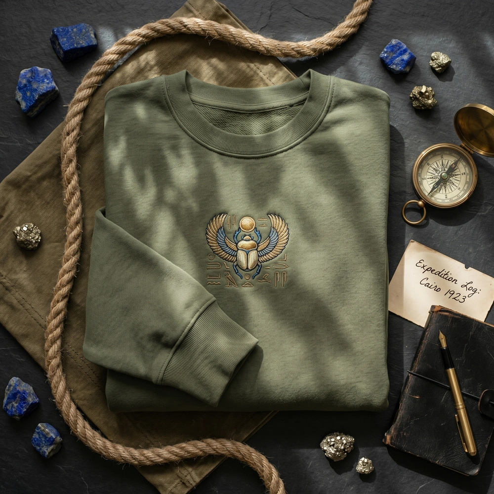 The Egyptian scarab beetle embroidered sweatshirt is a premium machine-embroidered piece featuring a striking golden scarab with iridescent wings—the ultimate archaeology aesthetic.