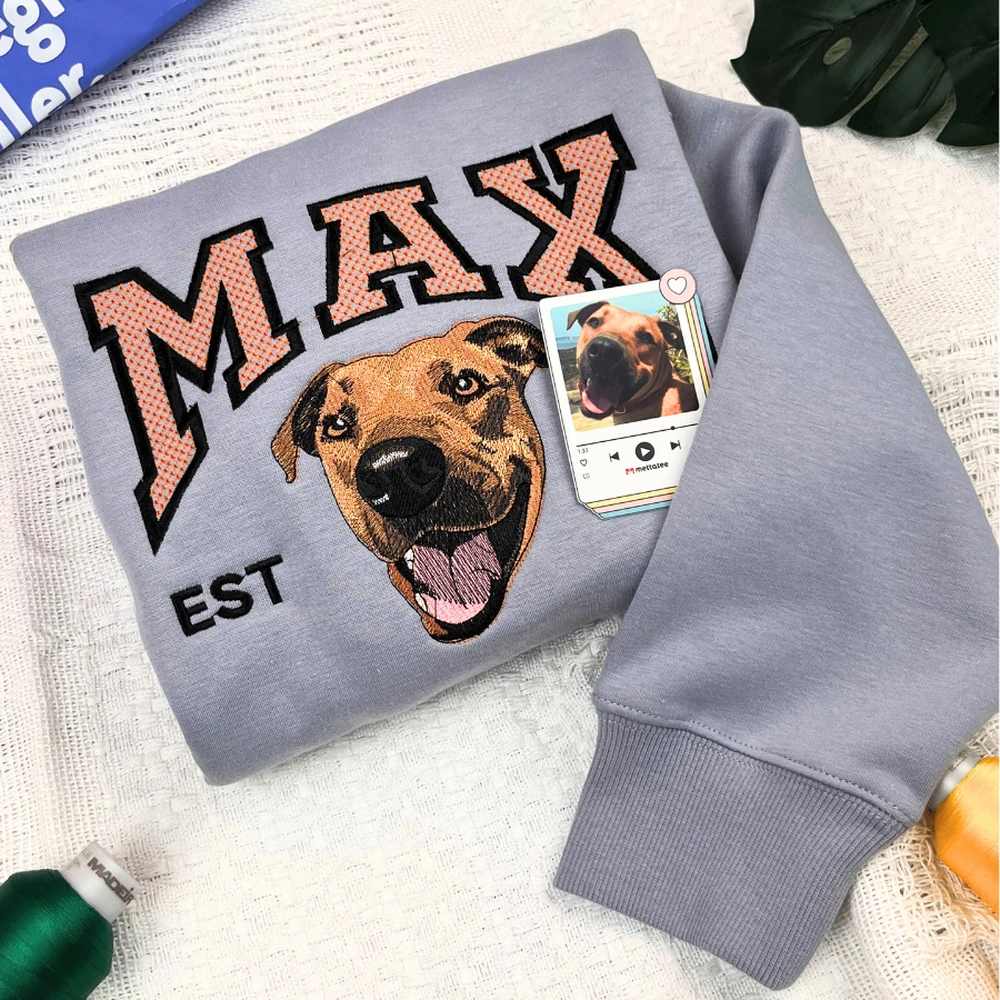 Transform your favorite photo into a wearable keepsake with a custom embroidered dog sweatshirt. The perfect dog mom gift for everyday comfort and style.