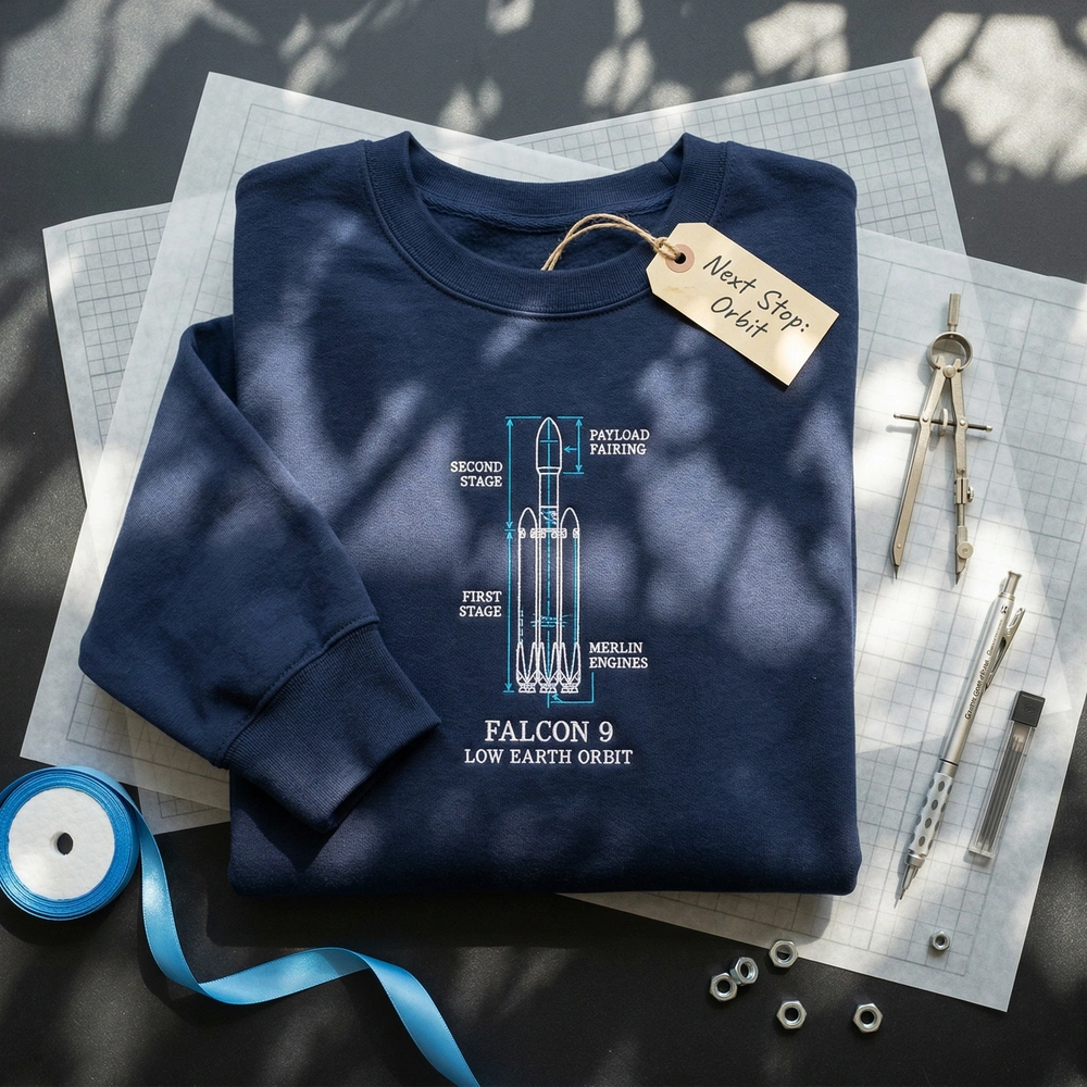 The Falcon 9 embroidered sweatshirt features a detailed rocket blueprint schematic, perfect for aerospace engineers and space exploration enthusiasts.