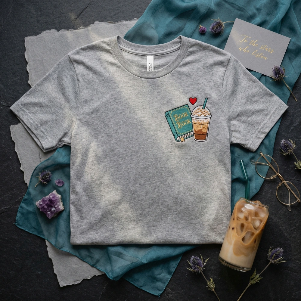This design is inspired by the modern “books and coffee” aesthetic popular among fans of high-fantasy romance series. It celebrates the cozy feeling of diving into a thick novel with a favorite caffeinated drink by your side.