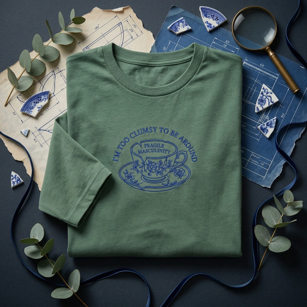 This design is inspired by popular feminist internet culture and the “fragile masculinity” meme. It uses the visual metaphor of delicate, easily broken fine china to humorously comment on social dynamics, making it a favorite for those who enjoy satirical and activist apparel.