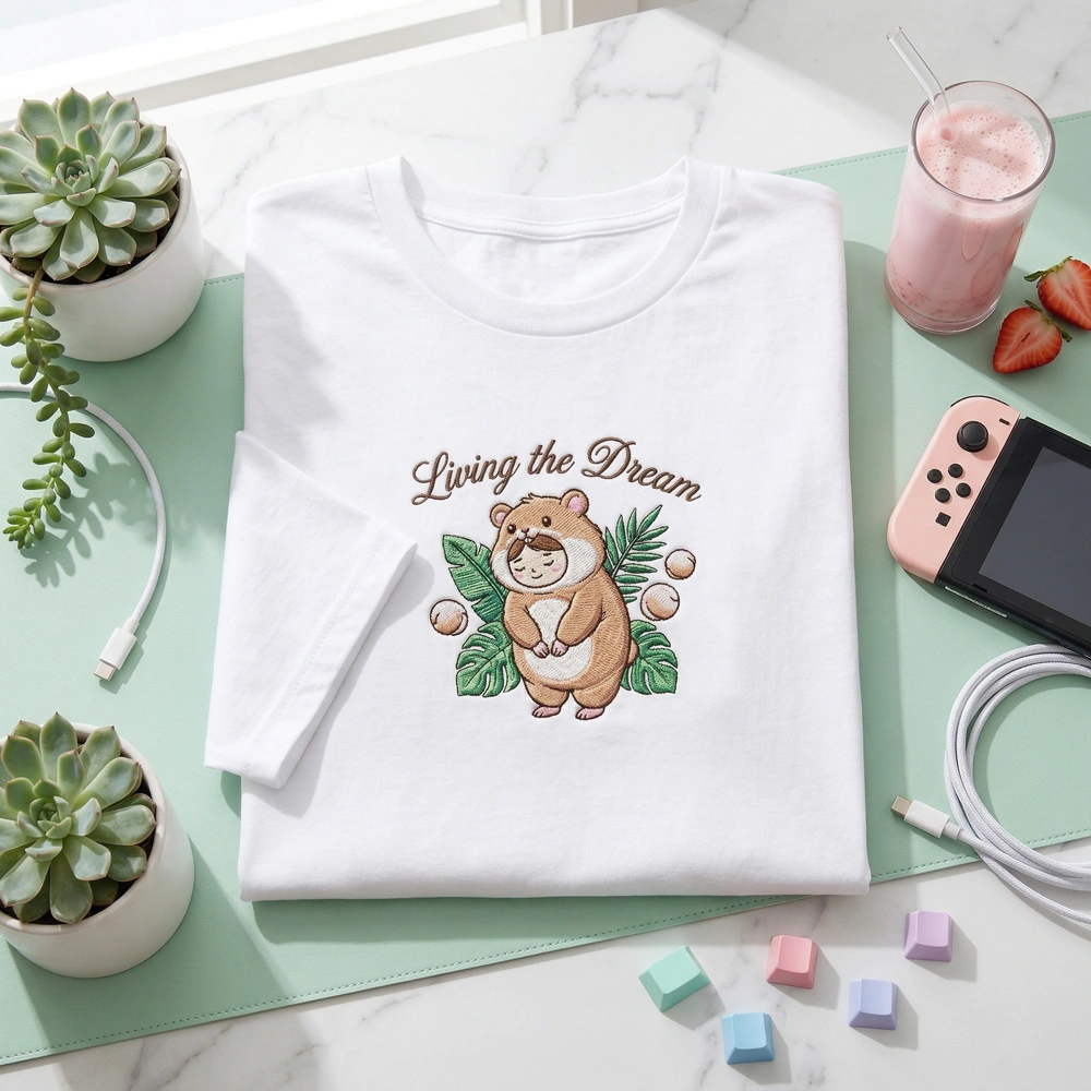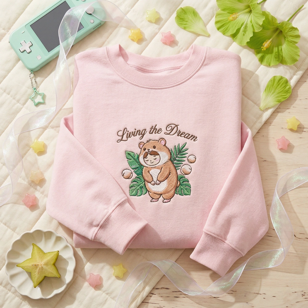 This design is a masterclass in ‘cozy-chaos’ aesthetics. Centered on a sand-colored garment, the embroidery features a bowing character in an oversized, fluffy hamster suit with two perfect spheres serving as floating hands. The vibrant color palette includes Kawaii Pink (#FFB6C1), Hamster Brown (#DEB887), and Island Green (#32CD32), all brought to life with premium thread. The embroidery measures a substantial 16cm x 20cm and utilizes 5 distinct thread colors to ensure the ‘LIVING THE DREAM’ typography pops in saturated pink.
