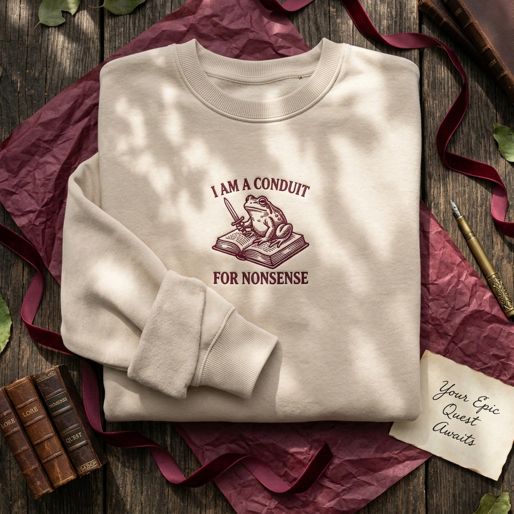 This exclusive design features a heroic frog knight standing atop an open tome, rendered in a striking monochromatic palette. We use a deep, muted burgundy thread (#800020) that contrasts beautifully against the Sand-colored garment. The 10cm x 11cm embroidery utilizes a sophisticated mix of satin stitches for the “I AM A CONDUIT FOR NONSENSE” banner and fine running stitches to mimic the intricate linework of a vintage woodcut print. The result is a textured, high-sheen finish that captures every detail of the frog’s sword and the twinkling star accents.