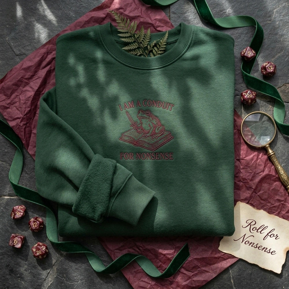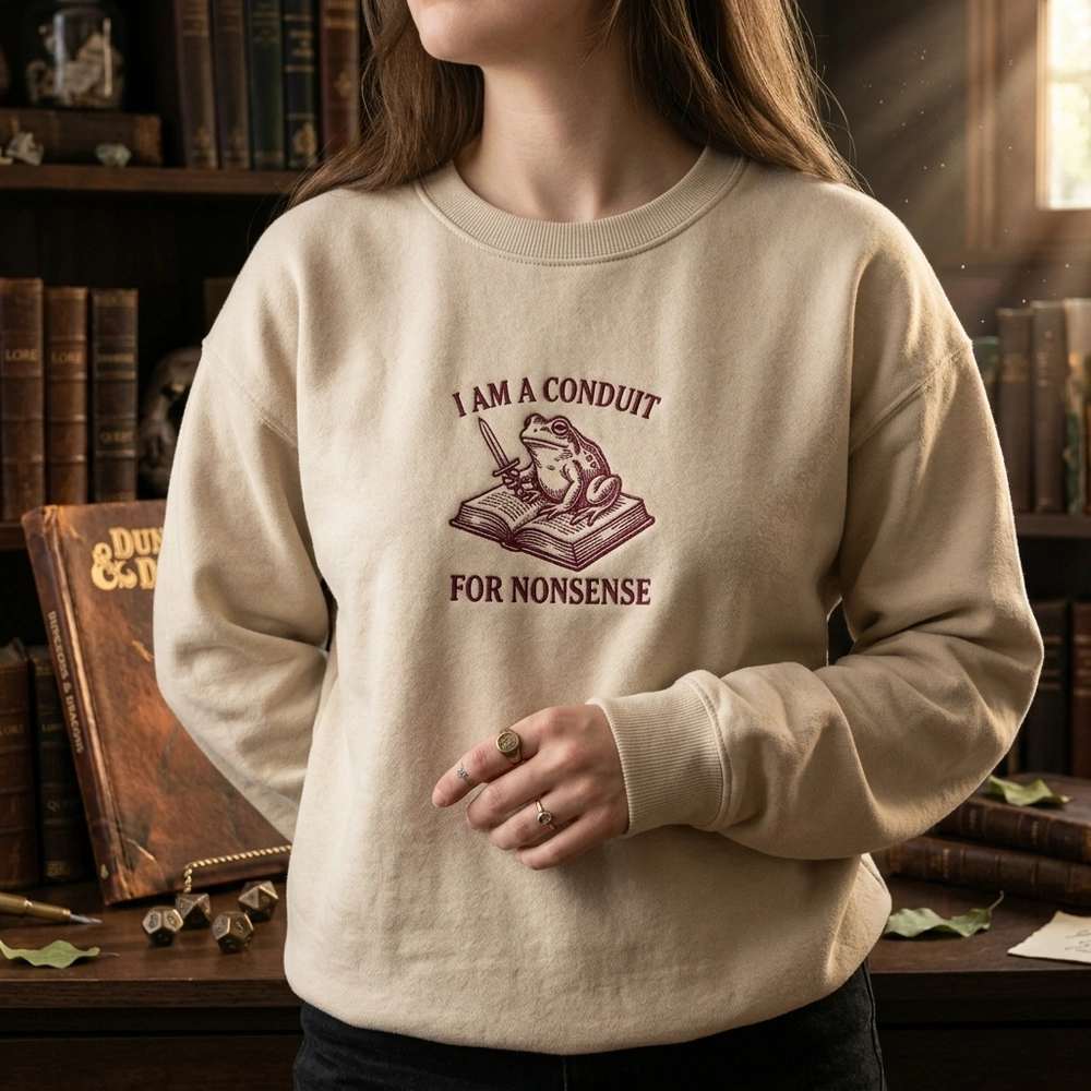 Embrace the chaos of the tabletop and the library with a touch of vintage elegance. This design is crafted for those who don’t take themselves too seriously but demand a classic, high-quality aesthetic. Whether you are a chaotic neutral rogue or a literature student deep in the archives, this piece connects your love for whimsical fantasy with modern internet humor. Browse more embroidered sweatshirts or find your new favorite frog sweatshirt in our curated collection.