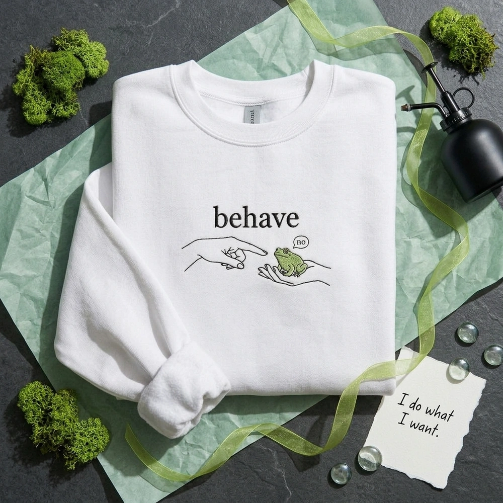 The frog meme sweatshirt is a premium machine-embroidered garment featuring the iconic stubborn ‘behave no’ frog design—perfect for frogcore fans.